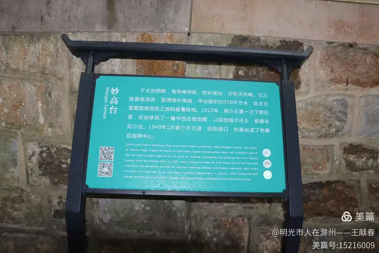 在妙高台的石墙前,我停下脚步。石碑上刻着这里的故事:三面悬崖,平台不过三百五十平方米,却是雪窦山的高胜之地。蒋介石曾在此居住,1949年引退后,这里成了他最后的指挥所。碑文下方的二维码静静躺着,像是连接两个时代的接口。我凝视良久,山风从深渊吹来,带着凉意,也带着某种难以言说的沉重。