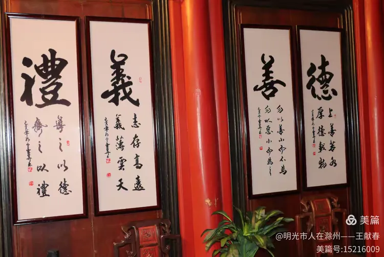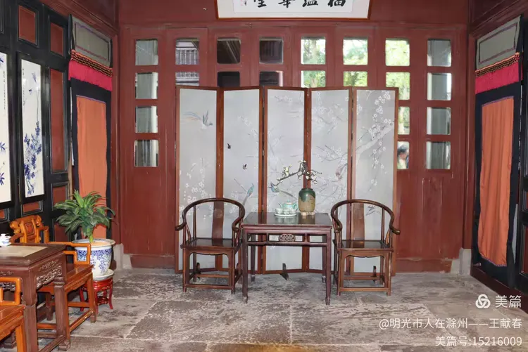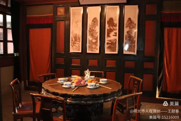 一间厢房内,红色木格门窗透出温润的光。屋中央摆着一张深色茶桌,配着老式木椅,桌上茶具齐整,仿佛主人刚离去不久。屏风上绘着花鸟,笔触淡雅,左侧一盆绿植悄然生长,为这静谧的空间添了生气。我想象着当年家族成员在此品茶议事的情景,言语未起,氛围已至。