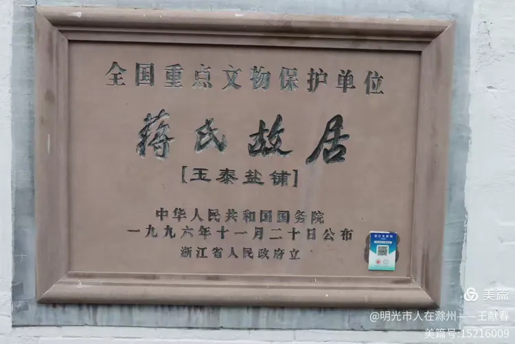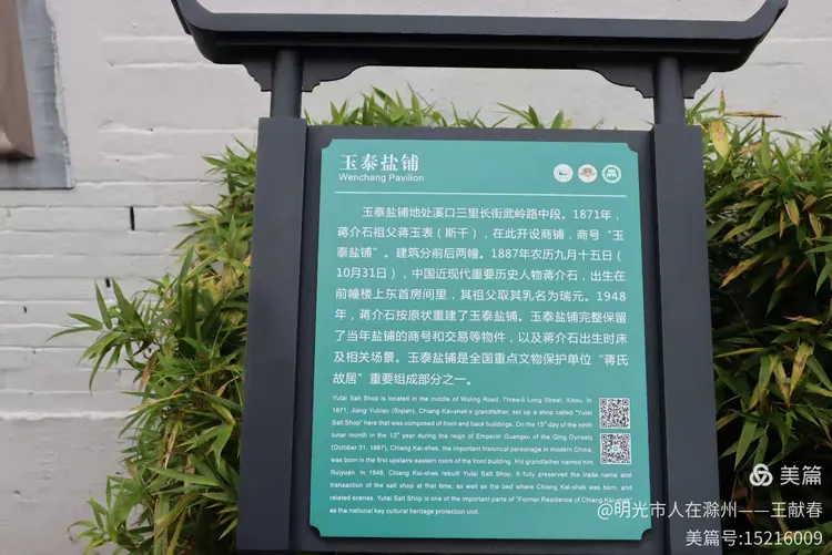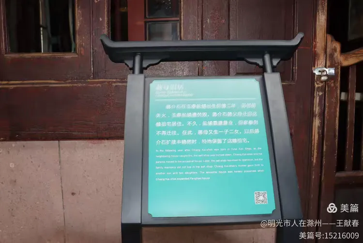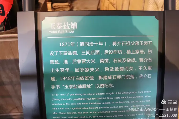 另一块介绍牌更具体地写着:盐铺由蒋玉表于1871年开设,最初卖盐、酒,后来兼营大米、菜饼、石灰等杂货。我站在门口,想象百年前这里人来人往,秤砣起落,吆喝声此起彼伏。一个家族的起点,竟藏在这条老街的寻常铺面之中。