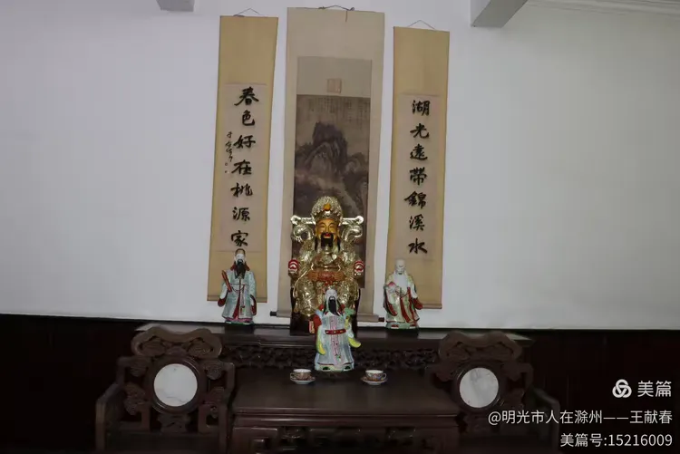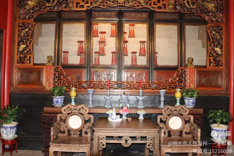 正厅里,一面雕花屏风立于中央,图案繁复,金红相映,前设香炉、蜡烛与果盘,似仍延续着某种仪式的痕迹。对称的装饰、庄重的色调,无不体现着传统礼制的讲究。站在这里,仿佛能听见节庆时的钟鼓声,看见长袍马褂的身影在厅中往来。