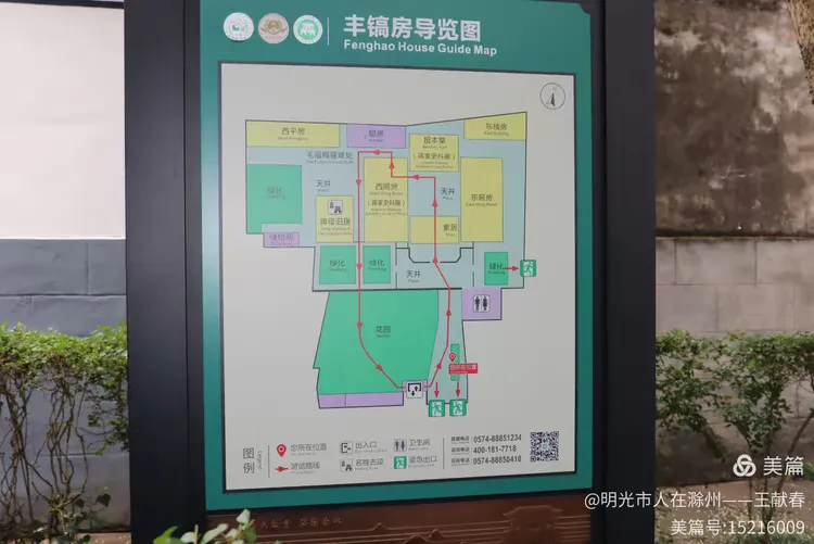 墙边立着一张丰镐房的导览图,灰墙为背景,绿植环绕,图上用不同颜色标注了西牛房、东牛房、天井、花园等区域,红色箭头清晰指引着游览路线。我照着图慢慢走,仿佛在阅读一本立体的家族史。每一间屋子都像一页泛黄的纸,记录着曾经的喧嚣与沉寂。
