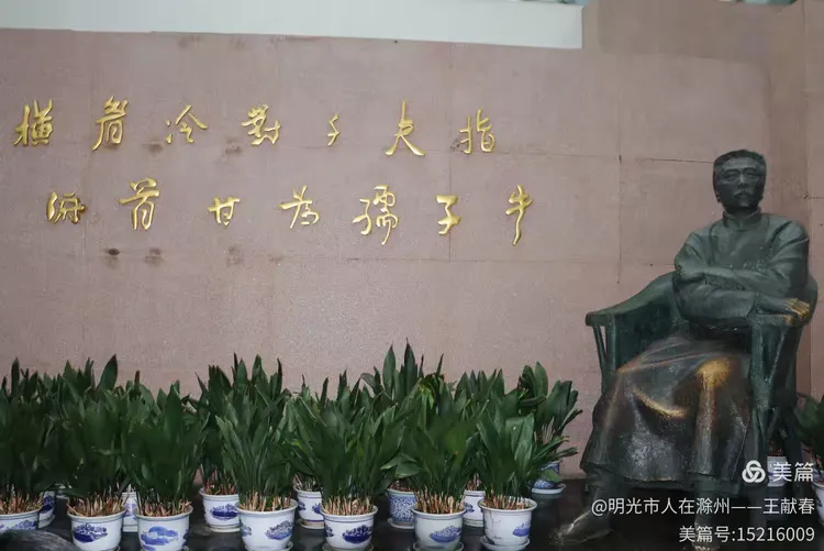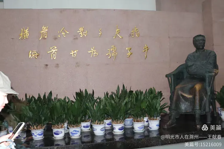 庭院中央,一尊鲁迅坐像沉静安详,手执书卷,目光深远。背后墙上刻着金色文字,字字千钧。几盆绿植环绕四周,雨珠在叶面滚动。我走近,轻声道:“先生,我又来看您了。”没有回应,但风起了,像是轻轻翻动一页书。