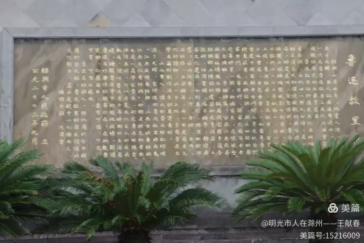 往前几步,一块巨大的石碑矗立眼前,金色的字迹在灰墙映衬下格外庄重。“鲁迅”二字高悬其上,碑文详述着他一生的足迹与时代的风云。两旁绿植静立,像守卫思想丰碑的卫士。雨水顺着碑角滑落,像是时间无声的流淌。站在这里,不必大声,心却早已肃然。