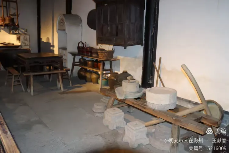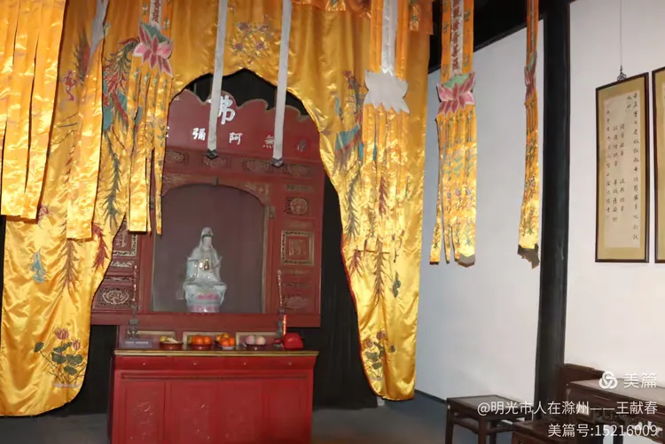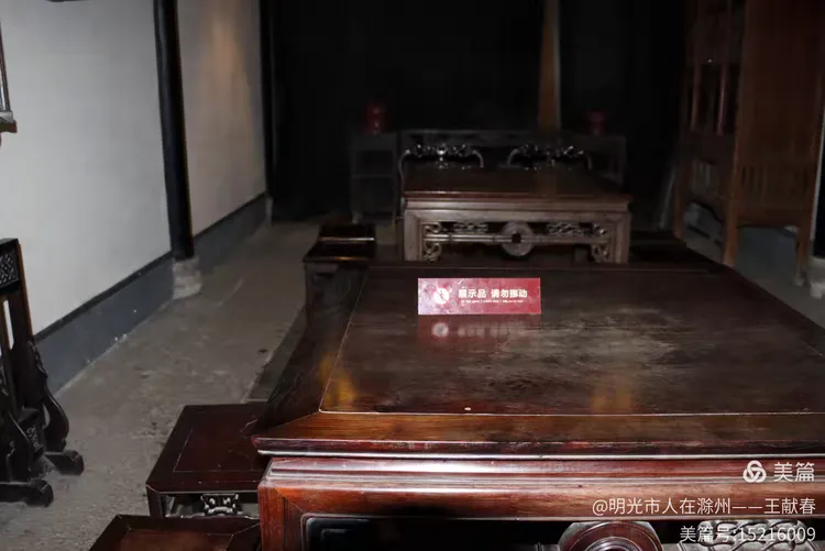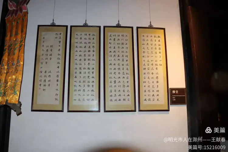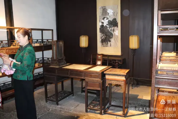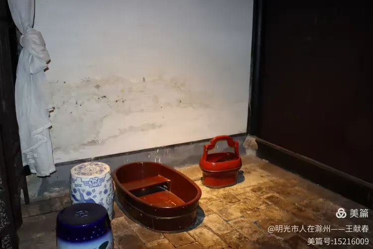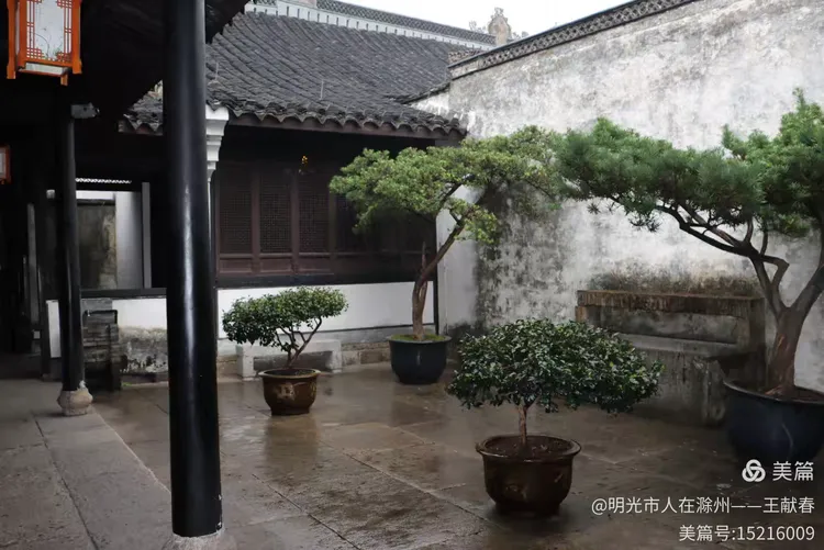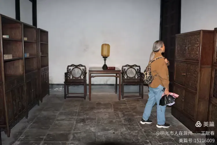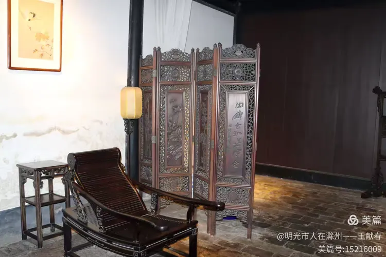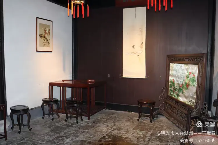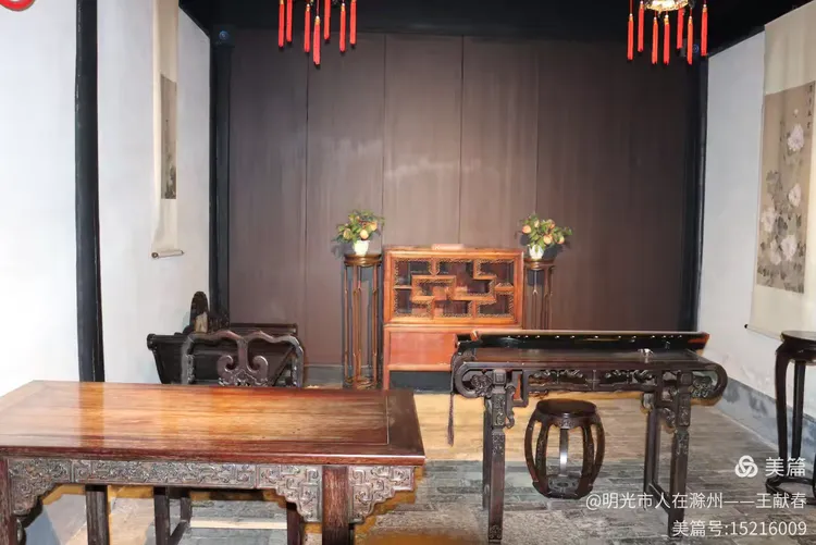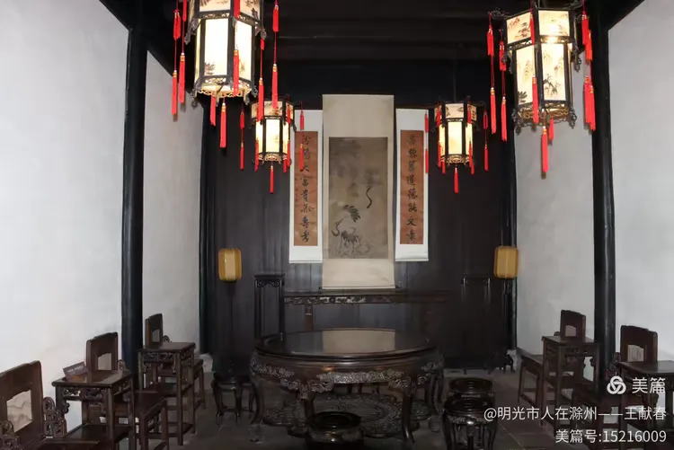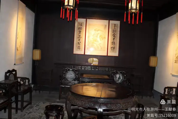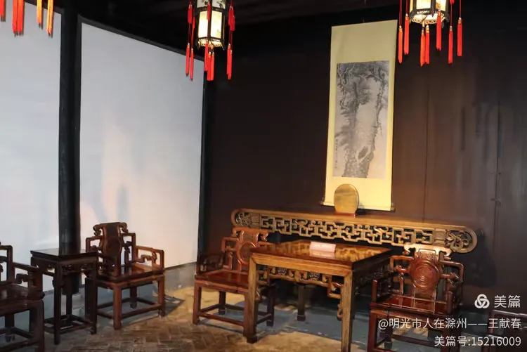 屋内深木为墙,一轴水墨画悬于中央,笔墨疏淡却意境悠远。两侧对称挂着书法条幅,灯笼垂着红穗,在微风中轻晃。几件老家具静静摆放,不喧哗,却自有分量。我坐在角落的椅上小憩,听雨打屋檐,恍惚间,似有私塾先生轻咳一声,唤道:“周树人,背书!”