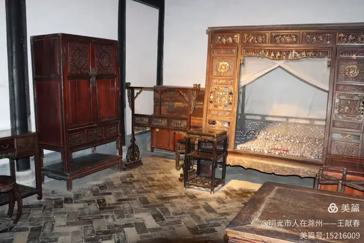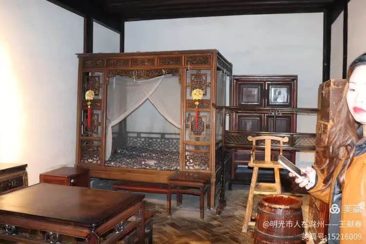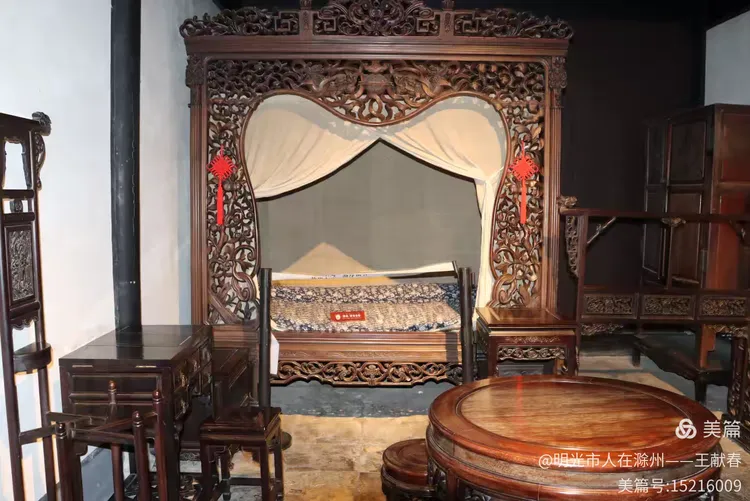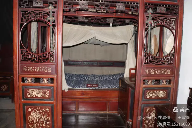 一张雕花木床静静陈列,深木床架上刻满花纹,蓝花床单铺得平整,白纱帐轻轻垂落。圆窗透光,床头床尾对称如诗。这不仅是家具,更像是一段被凝固的岁月,让人想起《从百草园到三味书屋》里那个赖床的清晨。