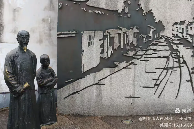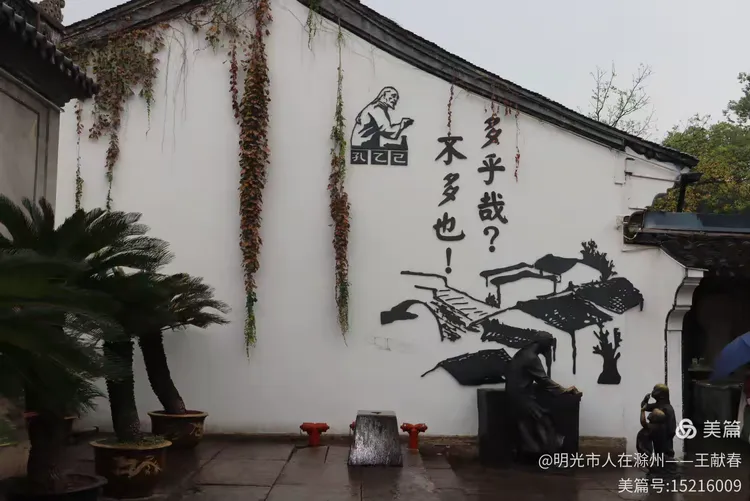 转过一堵白墙,墙面上绘着古意盎然的壁画:一位手持书卷的古人静立左侧,山水画卷在右,藤蔓悄然攀爬,绿意盎然。墙下“天乙”二字隐约可见,旁边一行墨迹遒劲的字跃入眼帘:“多乎哉?不多也!”——这句出自《孔乙己》的调侃,如今在雨中读来,竟带着几分幽默与苍凉。我驻足片刻,仿佛听见了百草园外那声悠长的叹息。
