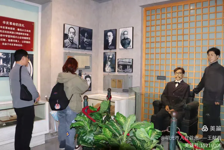 辛亥革命展区,墙上挂着革命者的肖像,展柜里陈列着泛黄的文件与旧物。一位女士正用手机拍照,一位讲解员站在蜡像旁讲述往事。我看着那位穿西装的蜡像,忽然觉得,那个时代的人,也都曾像我们一样,年轻、热血、满怀理想。