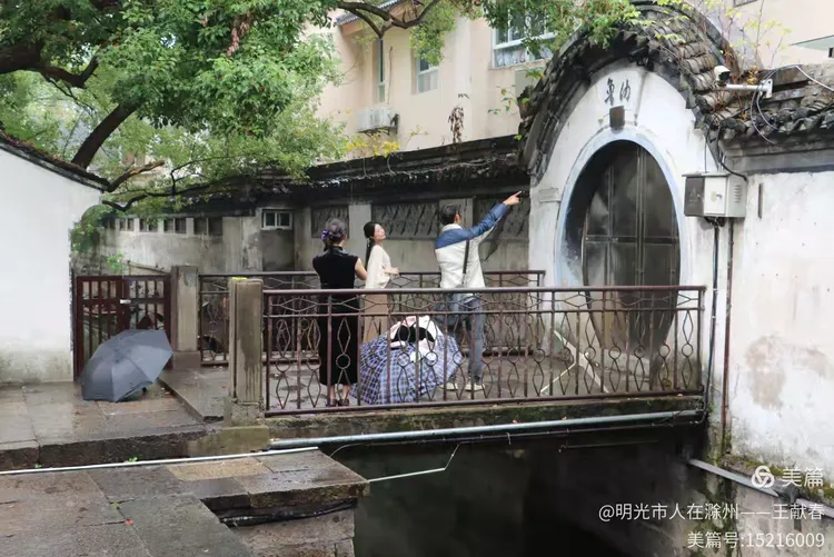一位女子戴着黄帽,手持黑伞,站在一座老屋前。她没急着进去,只是静静望着那雕花窗格和深瓦屋顶,像在与某个记忆重逢。门前绿植被雨水洗得发亮,我也停下脚步,拍下这一刻——不是为了风景,而是为了那份静默中的敬意。