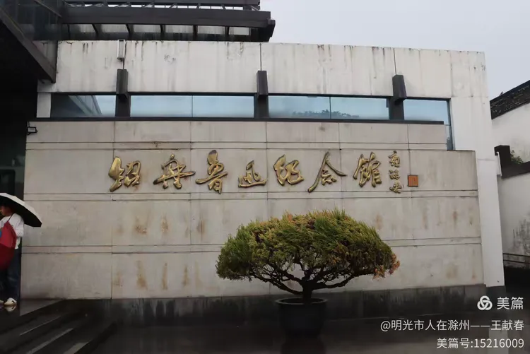 纪念馆外墙刻着“绍兴鲁迅纪念馆”几个金宇,浅灰墙面略显斑驳,却更添岁月质感。窗框深色,灌木修剪整齐,雨水在地面画出倒影。我站在一旁,看一位白衣人撑伞而立,像一幅静止的画。这一刻,历史与当下,在雨中悄然交汇。