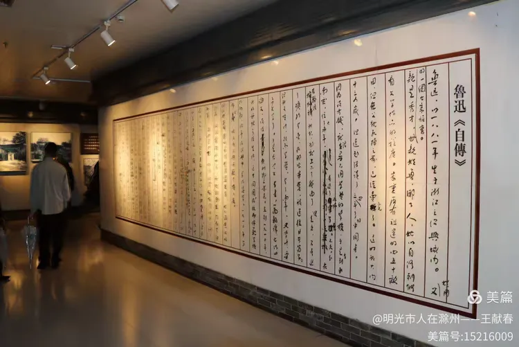 展厅内,一幅《自传》书法被红框装裱,灯光柔和地洒在字里行间。我站在左侧,看那些熟悉的句子一字排开:“我于一八八一年生在浙江省绍兴府城里……”有人背对着我默读,我也静静站着,仿佛在听少年周树人,亲口讲述他的一生。