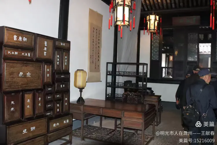 一间展室里,一个刻着“唐新”“旧唐书”的老柜子静静立着,旁边挂着一幅字,灯笼低垂,红穗轻摇。几位游客在柜前驻足,有人轻声念出柜上字样,像是在与历史对话。我站在一旁,没说话,只觉得那些泛黄的书页,仿佛就藏在这柜子深处,等着被重新翻开。