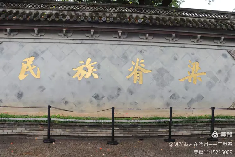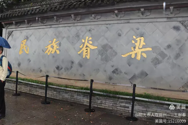 一面红墙上,“民族脊梁”四个大字赫然入目,金光熠熠,直击人心。檐角飞翘,红栏环绕,一株绿植在墙角静静生长。一位游客撑着蓝伞走过,背影匆匆,却仿佛也在这四个字前顿了顿脚步。这不只是对鲁迅的评价,更像是刻在这座城市骨子里的精神印记。