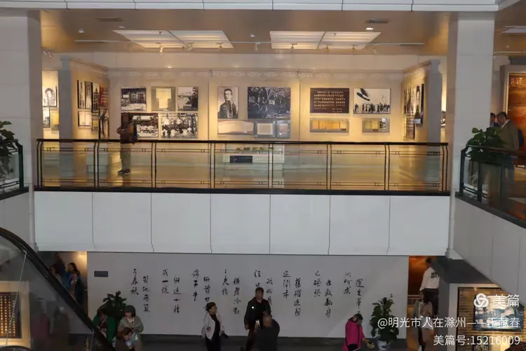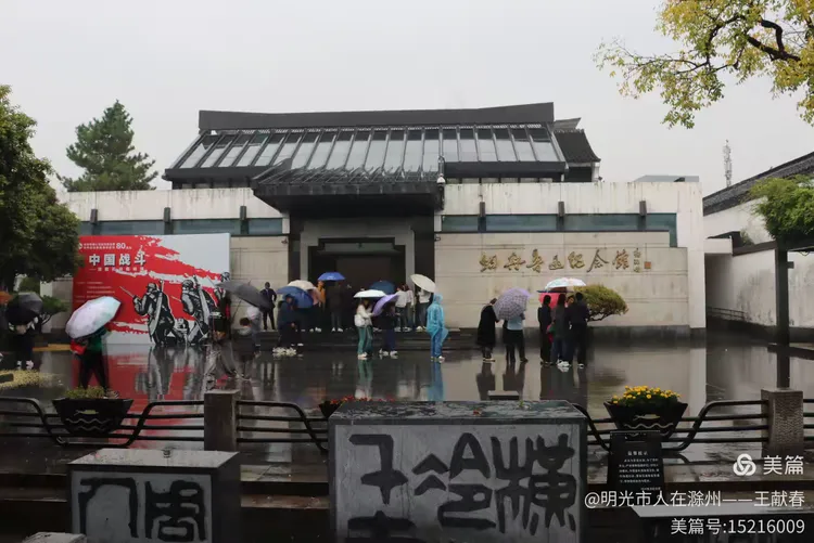 一座融合现代与传统的建筑前,人群撑伞聚集。白墙灰顶,左侧红展板写着展览信息,地面湿漉漉地映着天色。这里或许是纪念馆的新馆,庄重而不失温度。我走进去,灯光柔和,脚步轻悄,像踏入一段不容打扰的历史。