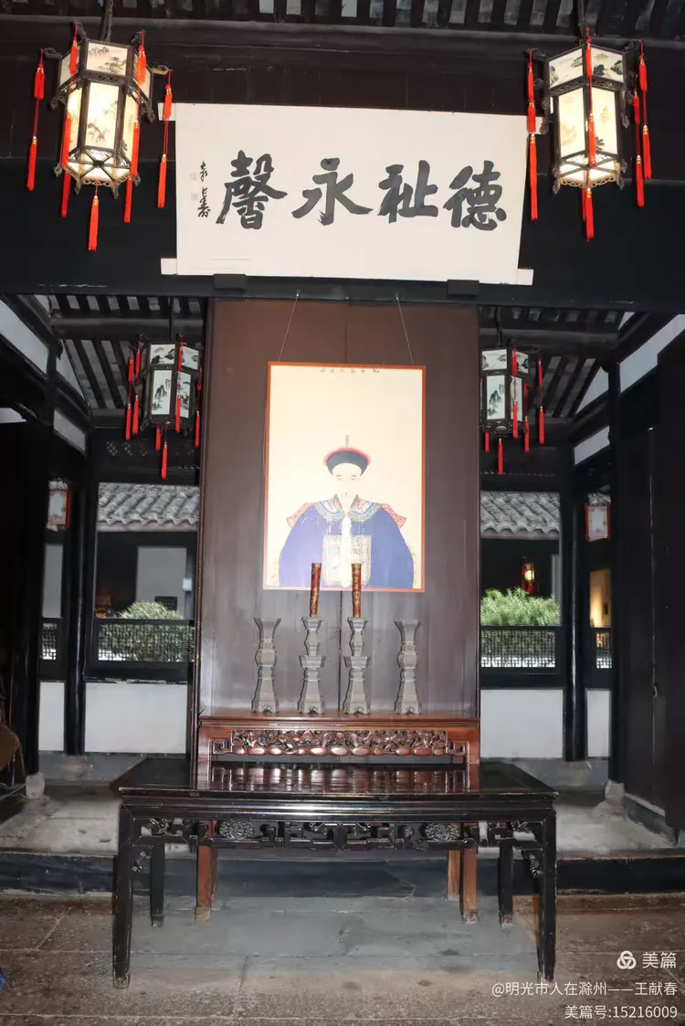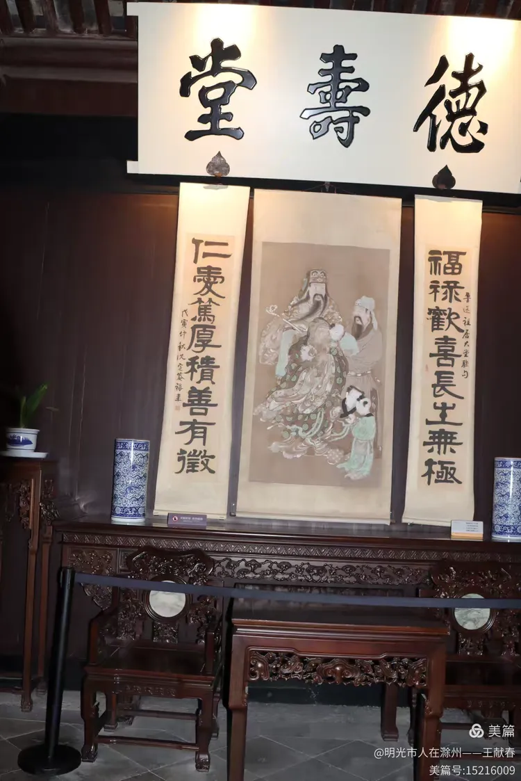 步入一间老屋,抬头见“德寿堂”匾额高悬,两侧对联写着“仁爱笃厚积善有微,福禄欢喜长土无极”,字字温厚,如长辈叮咛。下方画像中的人物身着长袍,目光沉静;几件瓷器错落有致地摆在一旁,釉色温润。这不仅是陈列,更像是一户人家未曾熄灭的生活余温。