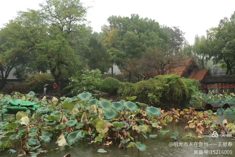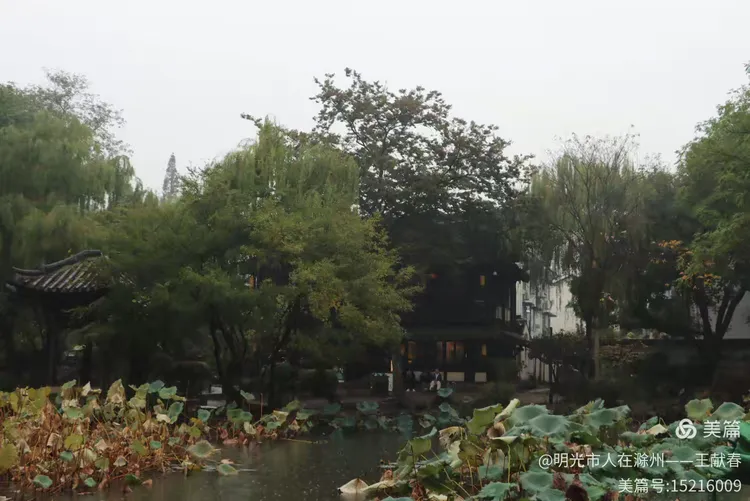 放眼望去,树木葱茏,绿意层层叠叠,池中荷叶铺展,如绿云浮水。远处红瓦屋宇隐现,与高树相映,勾勒出园林的轮廓。雨雾朦胧,却让色彩更显温润。这不只是一园之景,更是一幅活着的江南长卷。