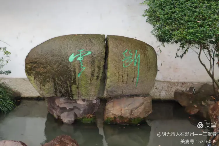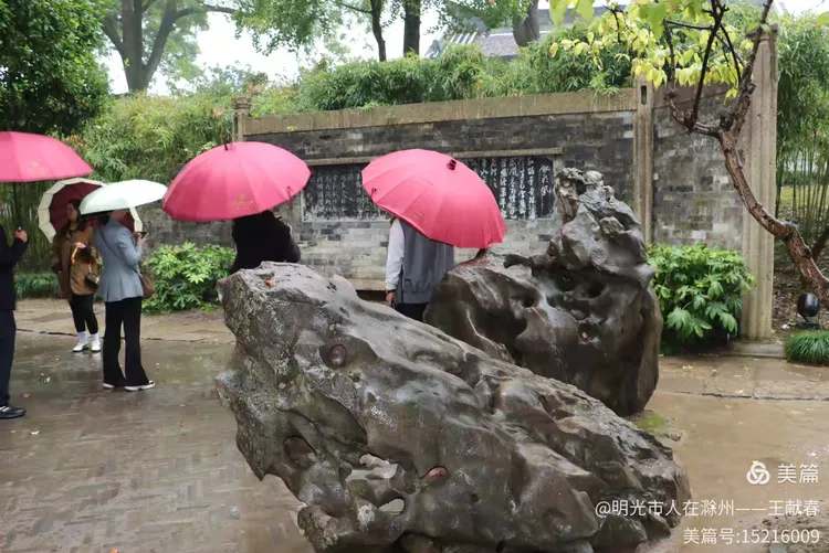 庭院石墙上刻着字,旁边立着一块奇形假山石,绿植环绕,生机盎然。红白雨伞在石前缓缓移动,像一幅缓缓展开的工笔画。雨中的字迹更显清晰,仿佛每一笔都浸透了湿漉漉的思念。这园子,原就是为思念而生的。