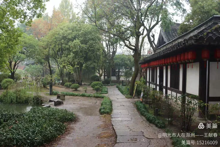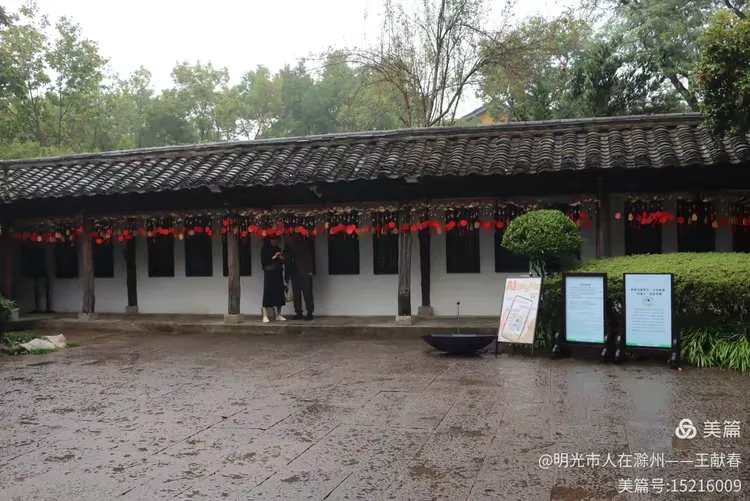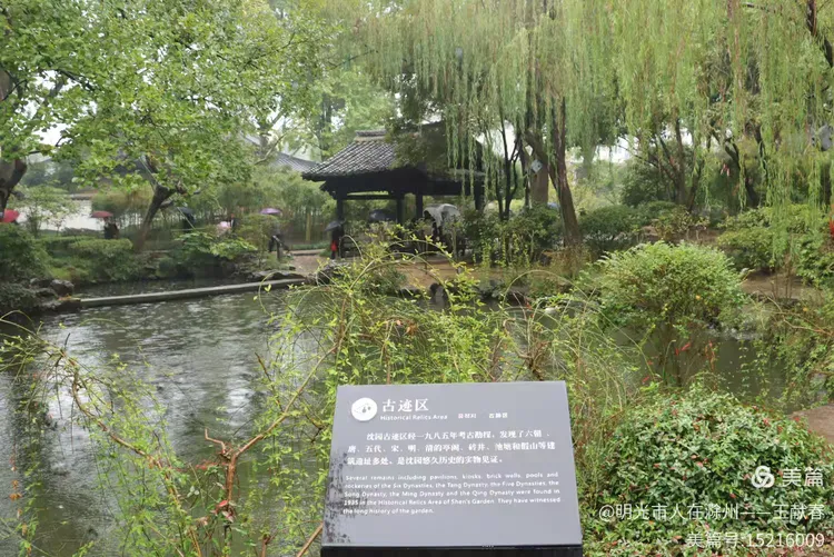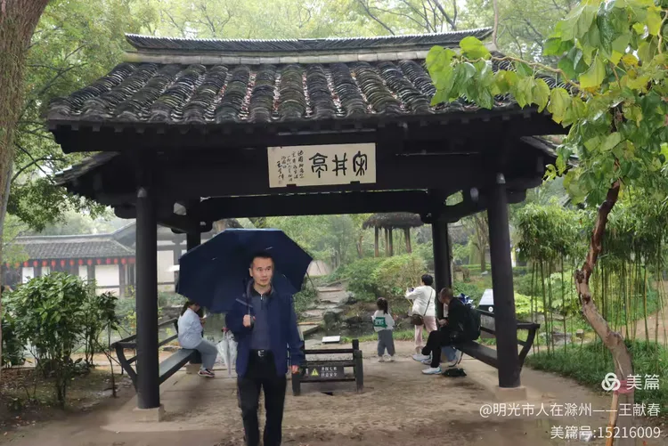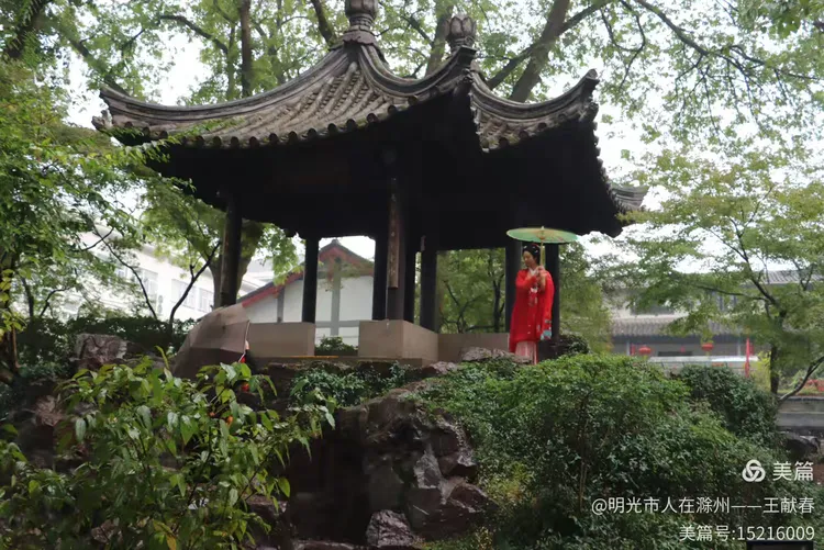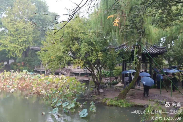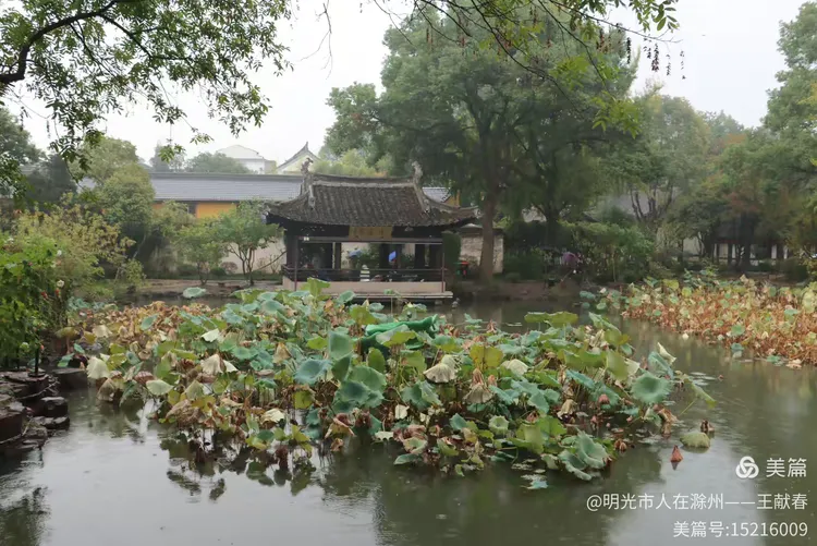 雨未停,亭边垂柳拂水,几片荷叶浮在池面,静得能听见雨滴落下的节奏。有人撑着蓝伞在亭前驻足,身影融入这幽静的画面。我站在檐下,看水波轻皱,仿佛看见陆游与唐婉的叹息,也落在这片池塘里,年年泛起涟漪。