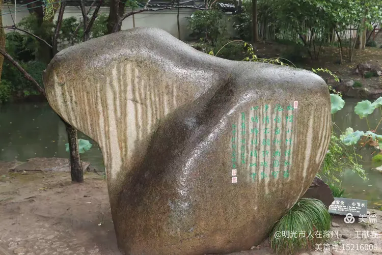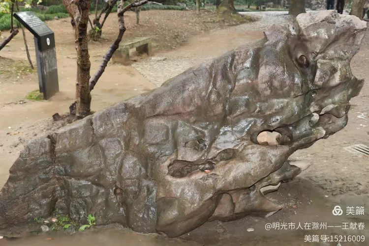 一块奇石静卧雨中,纹理如河,似经千年水流冲刷而成。石旁立着信息牌,一张石凳空着,仿佛在等谁来坐一坐,听一听石头讲的故事。地面湿润,空气清冽,这石头不语,却比任何碑文都更接近自然的本真。