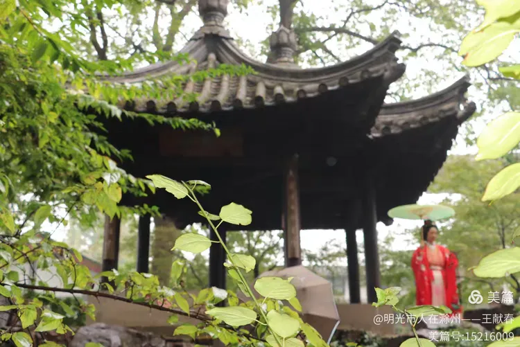 忽然,一抹红影掠过眼帘——亭中立着一位女子,身着红衣,手持绿伞,姿态如画。她静静望着园中雨景,像从宋词里走出来的意象。绿树掩映,红灯轻摇,她不说话,却让整个画面活了起来,仿佛时光在此刻打了个结,绾住了千年的风雅。