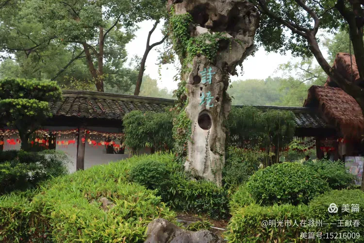 一座茅草亭隐于林间,柱上刻字,古朴自然。有人撑蓝伞驻足,似在读那柱上诗文。茅顶厚实,挡得住风雨,也守得住一份远离尘嚣的宁静。这里不像景点,倒像隐士的居所,藏在园中,等有缘人偶然相逢。