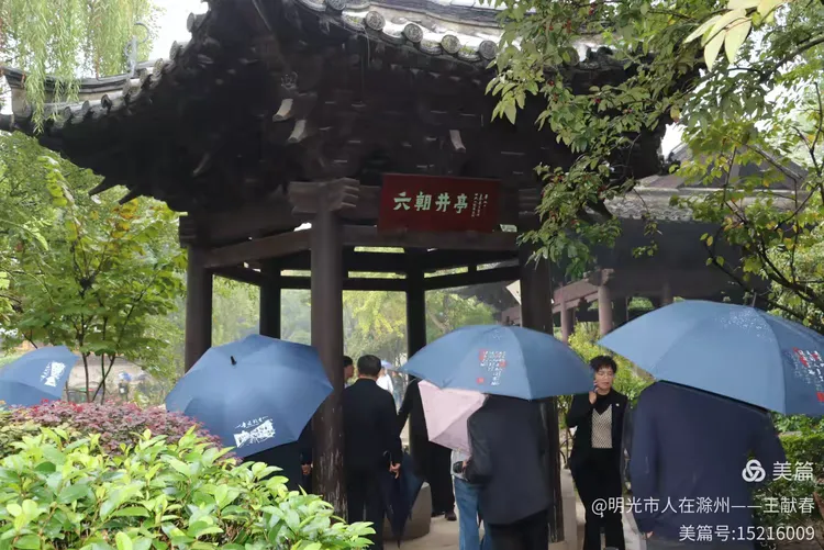 “六朝井亭”四字在红匾上醒目,亭前人影三三两两,蓝伞点点,像雨中开放的花。古井无言,却似藏着千年的回响。树影婆娑,雨声淅沥,这一刻,历史不是书页上的字,而是脚下的湿石、耳畔的风、鼻尖的草木清气。