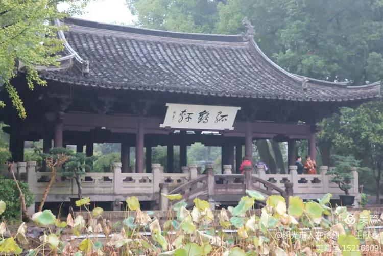 “孤鹜亭”匾额高悬,石栏上摆着几盆绿植,荷叶浮于近。。。。。。