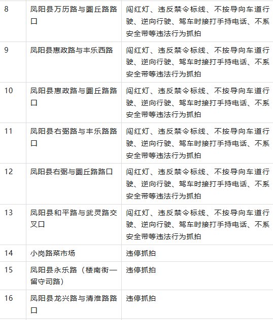 为进一步提高交通参与者的交通安全意识,预防和减少道路交通事故发生,凤阳县公安局交通管理大队拟于2025年11月16日零时启用以下电子监控抓拍设备,现将设备类型和点位分布公告如下: