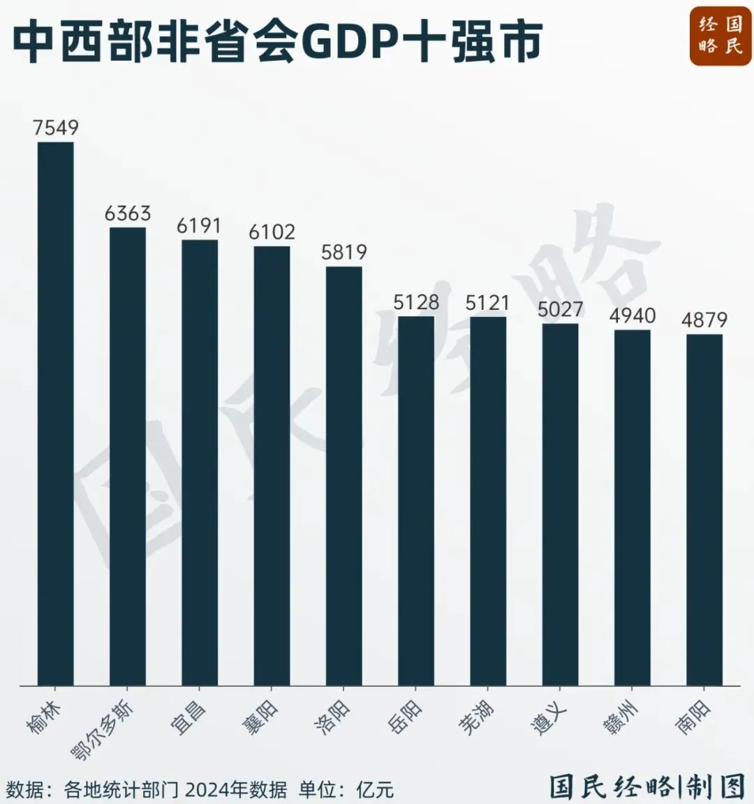这两年情况出现变化。榆林、鄂尔多斯异军突起,榆林拿下中西部非省会第一城,剑指万亿GDP城市。