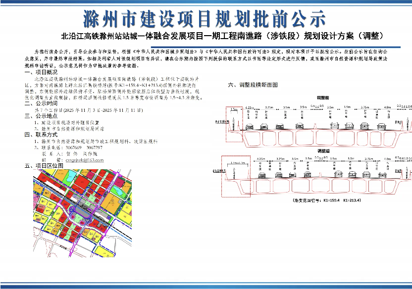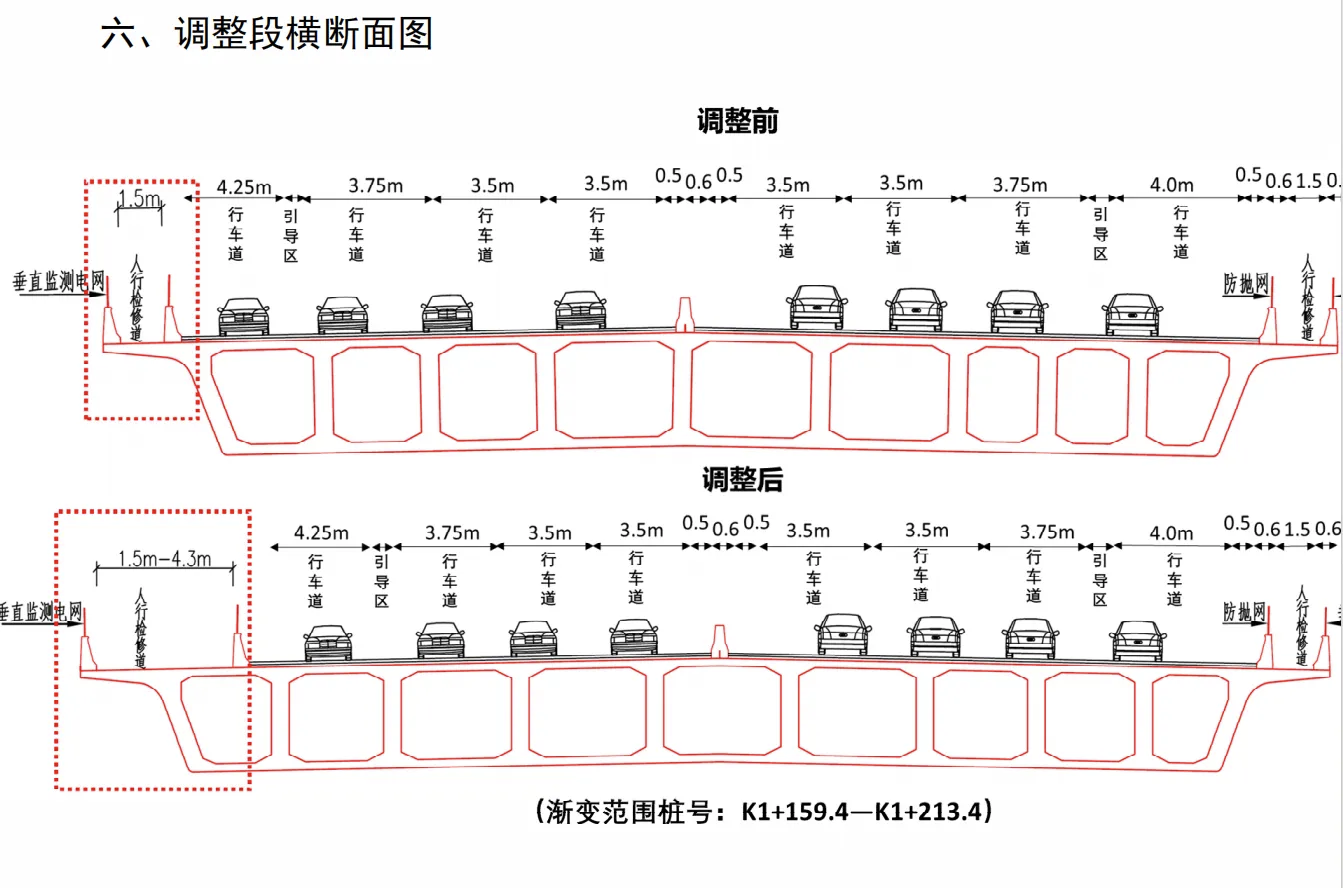 项目概况:北沿江高铁滁州站站城一体融合发展项目南谯路(涉铁段)工程位于高铁站片区,方案对南谯路上跨北沿江高铁桥跨(桩号:K1+159.4~K1+213.4)西侧外轮廓进行调整,东侧轮廓外边缘保持不变。原桥梁西侧外轮廓依照总体线型为曲线过渡,现优化调整为直线顺接,即桥梁西侧检修通道从1.5米等宽布设调整为 1.5~4.3米渐变。