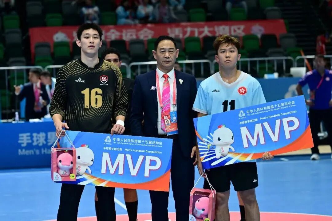 11月8日,安徽队球员丁浩然(左)与香港队球员李少聪(右)获评本场最佳运动员。当日,在香港进行的第十五届全国运动会男子手球半决赛中,安徽队24比21胜香港队。