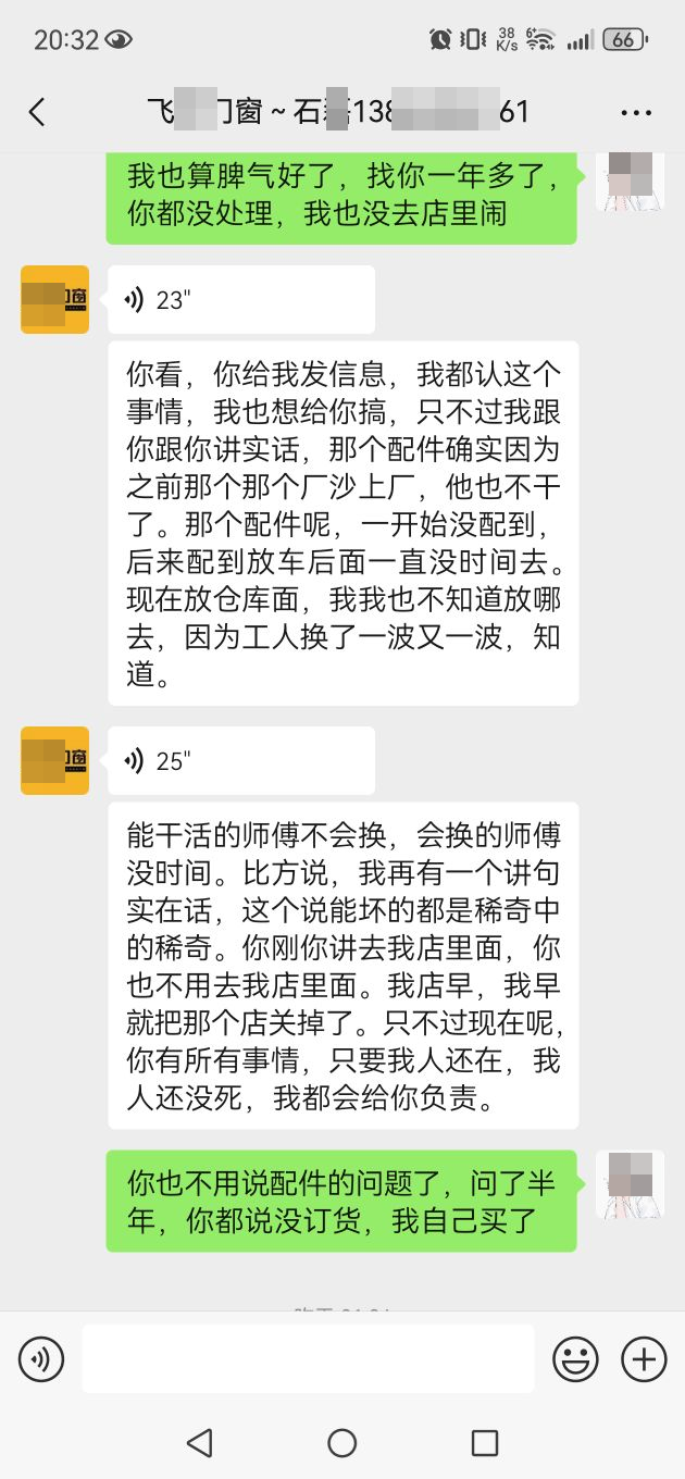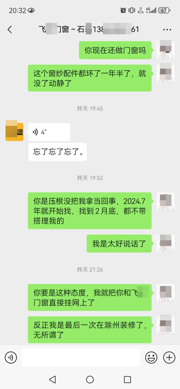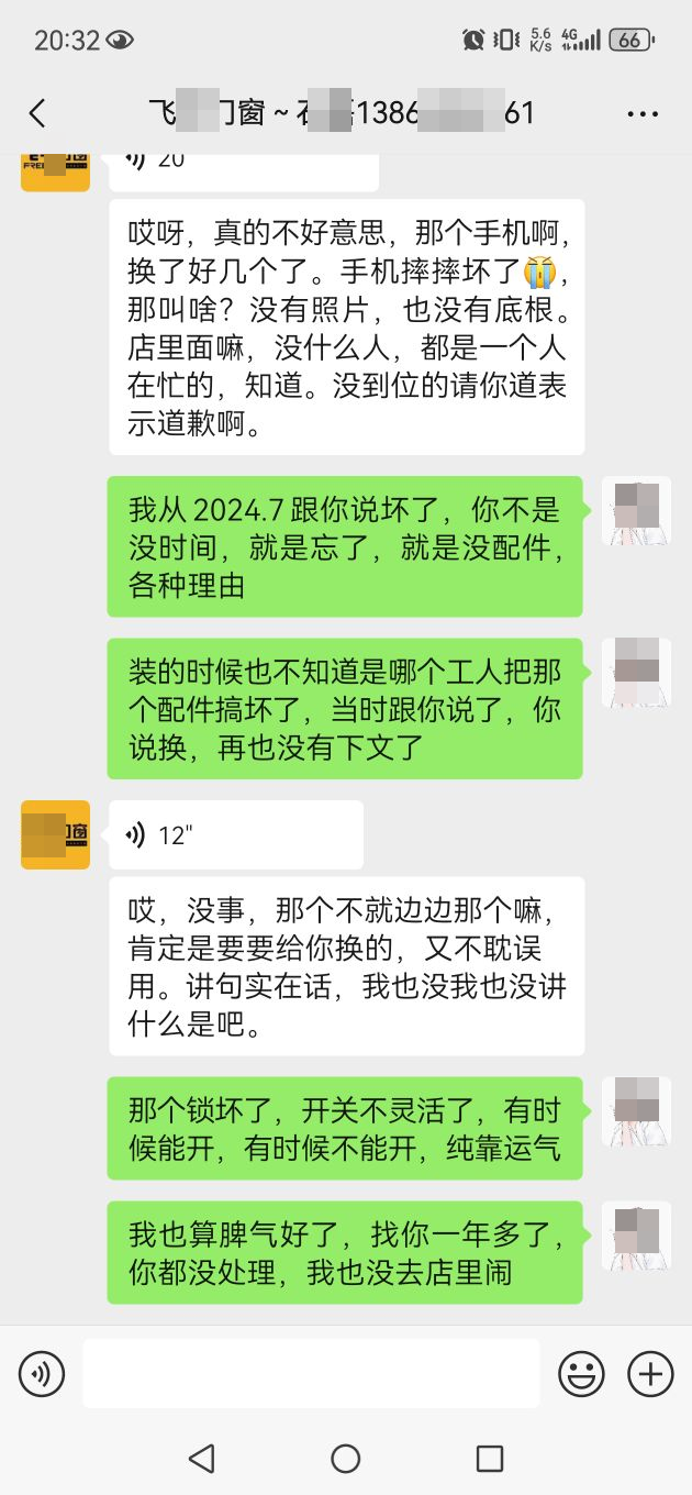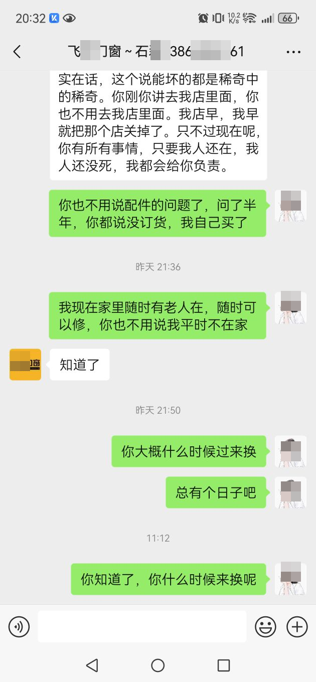 买门窗请避雷飞*门窗,没有售后,只有一次性生意,安装时工人把锁扣弄坏了,2024年7月就开始找老板了,永远都是没时间,没配件,配件忘了,他忘了。。。其他的自己看聊天记录吧