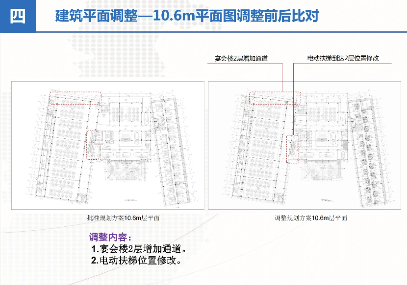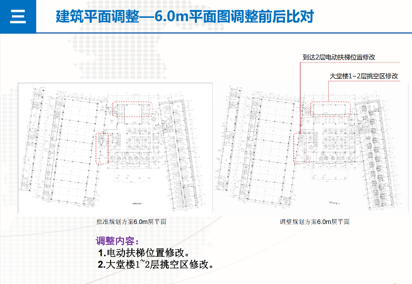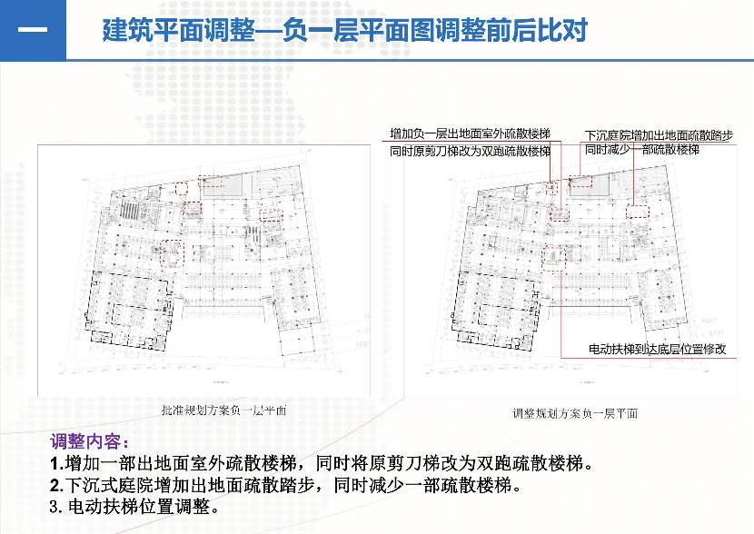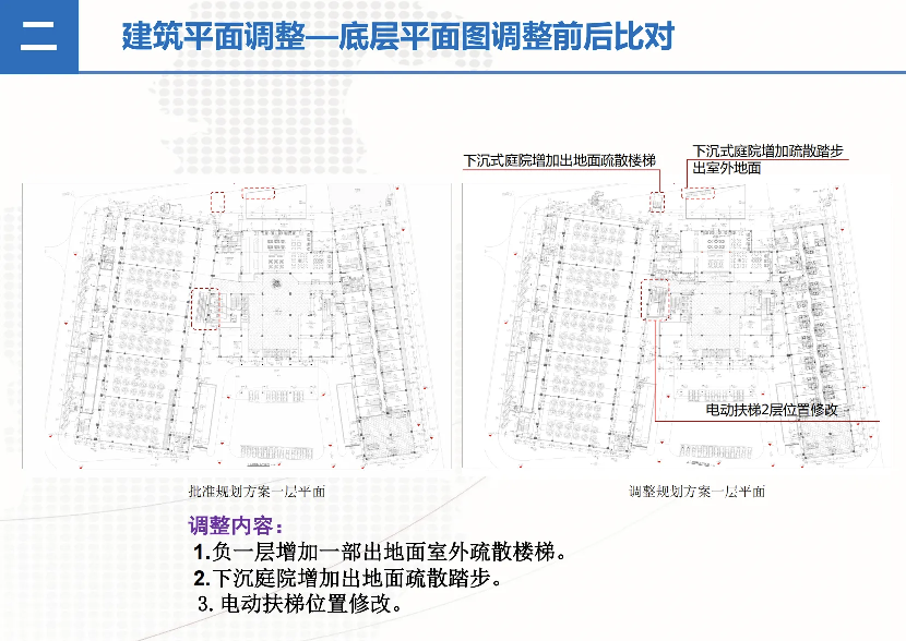 2、建筑平面图中对电动扶梯位置、疏散楼梯设置、局部功能布局等进行调整;