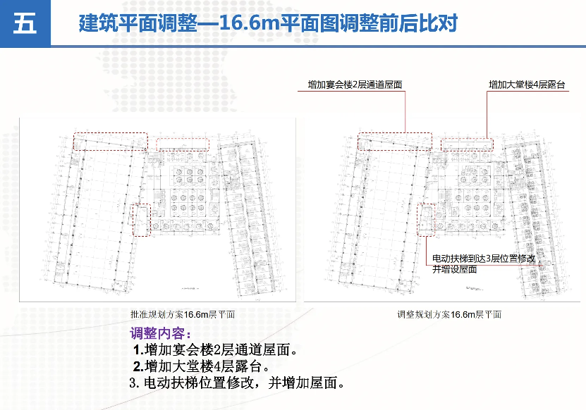 3、建筑立面图中对部分外墙装饰、客房楼屋顶构架高度等进行调整。