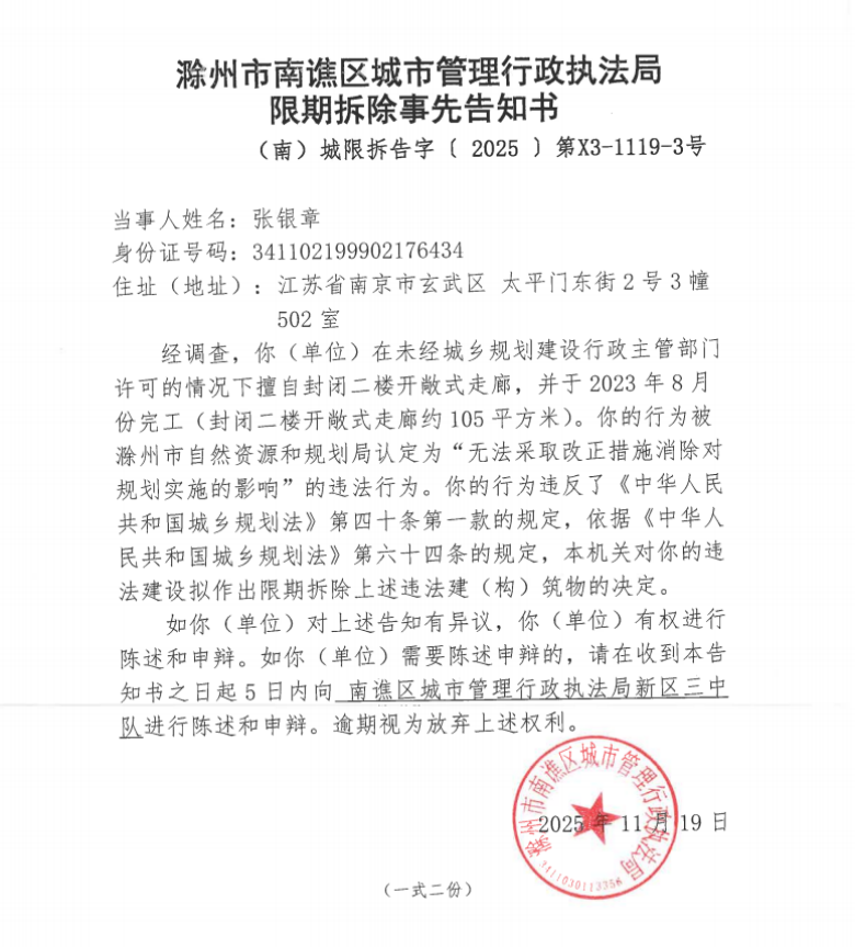 本机关于2025年11月19日作出《限期拆除违法建设决定事先告知书》(南城执限拆先告〔2025〕X3-1119-3号),告知南谯区乌衣镇碧桂园春风雅园小区商业C号楼215室、216室、217室、218室、219室前封闭二楼开敞式走廊形成违法建设约105平方米的权利人张银章对未取得建设工程规划许可证搭建的建(构)筑物自行拆除。(具体违法事实、处理依据等,详见以上《限期拆除违法建设决定事先告知书》)。