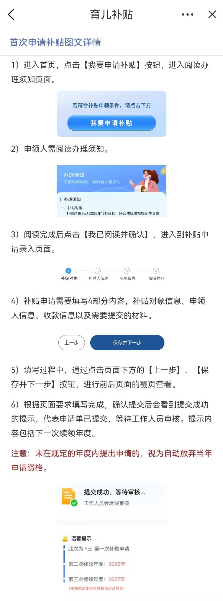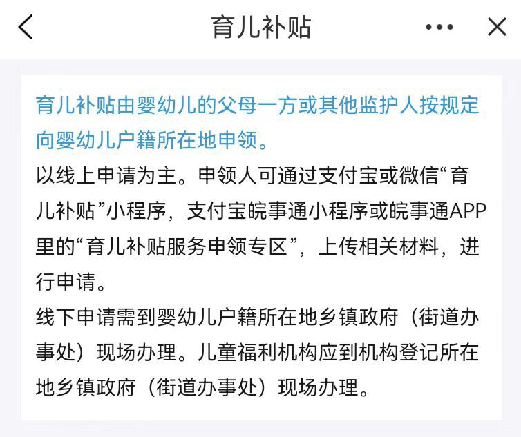 以线上申请为主。申领人可通过支付宝或微信“育儿补贴”小程序,支付宝皖事通小程序或皖事通APP里的“育儿补贴服务申领专区”,上传相关材料,进行申请。