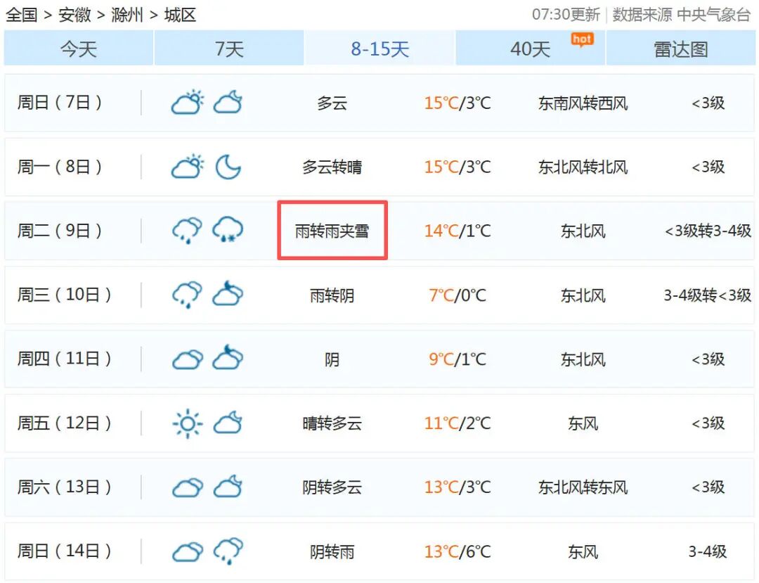 今天又是个艳阳天~ 近来晴好天气持续输出 滁州最高气温达到22℃ 但这样的好天气要结束了 冷空气即将扑袭安徽 滁州最高气温 将从22℃降至7℃ 暴跌15℃ 12月9日或将迎来雨夹雪 据安徽省气象台今天上午消息 未来一周全省以多云到晴天为主 今天夜里起至12月3日 受冷空气影响 全省平均气温将下降8~10℃ 局部11℃以上 同时全省偏北风力3~4级 阵风7级左右 冷空气过后 12月3-5日早晨最低气温 淮北地区和本省山区-5~-3℃ 其他地区-2~2℃ 看完安徽再看滁州 滁州市气象局今天上午发布 气象信息专报 12月2-3日 滁州有一次冷空气活动 气象专报显示 预计未来七天 以多云到晴天气为主 气温起伏较大 12月2-3日受冷空气影响 全市平均气温下降4~6℃ 同时偏北风增大至3~4级 阵风6~7级 冷空气过后 12月4日早晨 最低气温降至-2℃左右 另据中央气象台8-15天预报 12月9日 滁州或将迎来雨夹雪天气 11月30日 晴到多云,2~22℃ 12月1日 晴转多云,4~16℃ 12月2日 多云转阴,夜里阵风6~7级,6~13℃ 12月3日 多云到晴,0~7℃ 12月4日 晴转多云,-2~8℃ 12月5日 晴到多云,-1~10℃ 12月6日 晴到多云,0~16℃ 来源:中央气象台、安徽省气象台、滁州市气象局