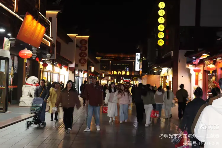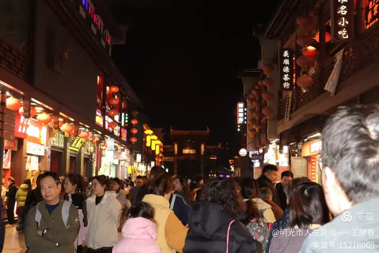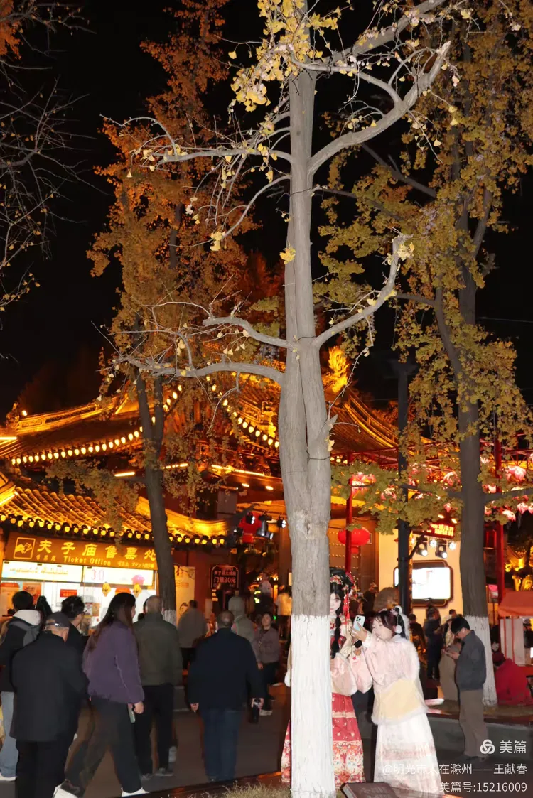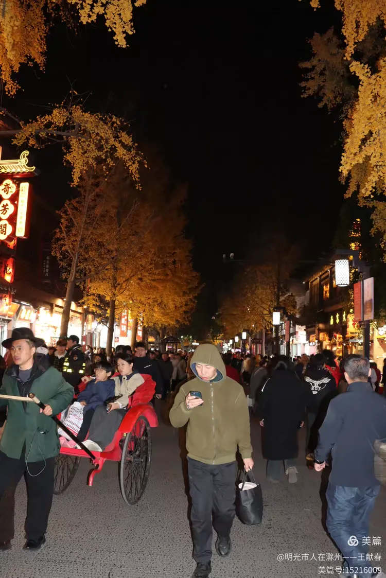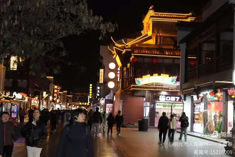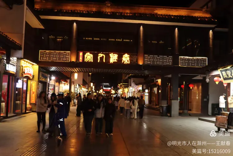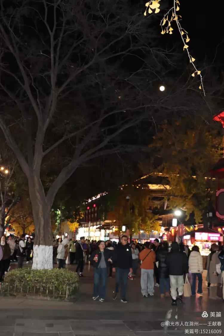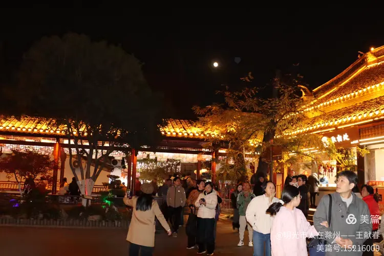 明月当空,街道两旁灯火通明,牌坊下人来人往。古树在灯光中投下斑驳的影,像是岁月的印章。我抬头望了望天,又看了看眼前的人间烟火,忽然觉得:活着,真好。