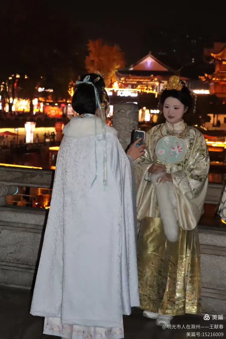 两位穿古装的女子在建筑前合影,一个背对镜头,白衣胜雪;一个手持团扇,金衣熠熠。她们的笑容在暖光中绽放,背景的飞檐与灯笼,仿佛为她们搭起了一座通往旧时光的桥。我悄悄走过,不愿打扰,却在心里为她们按下快门——这,不就是我们对美的向往吗?
