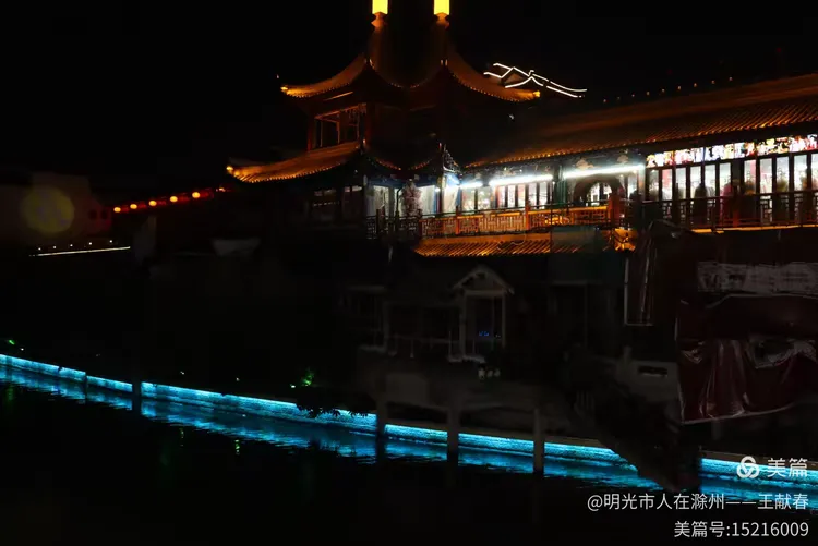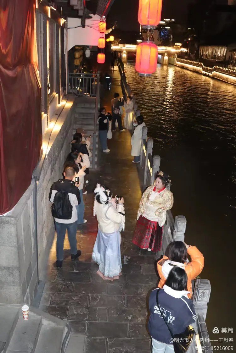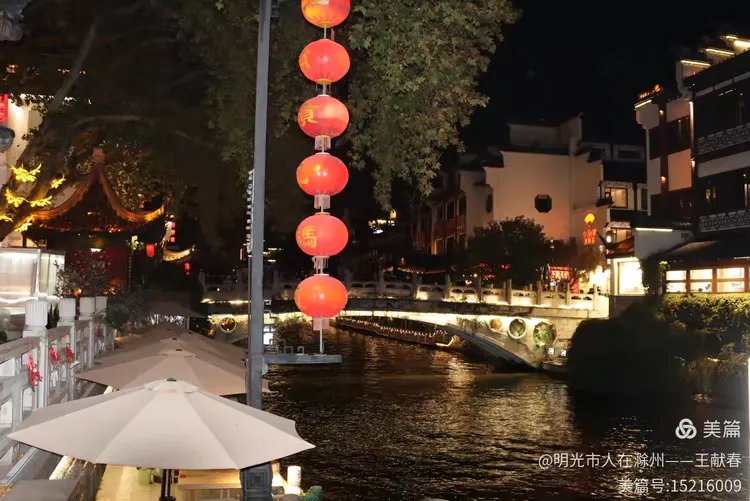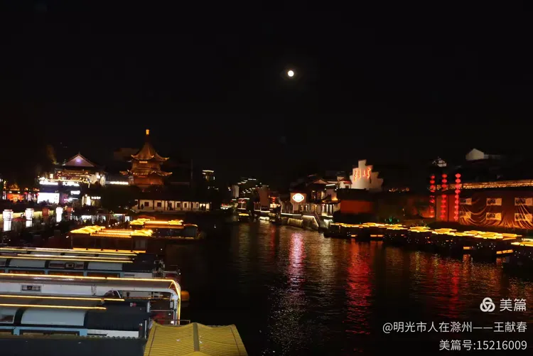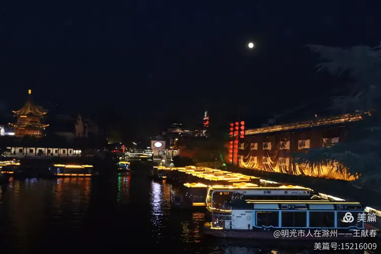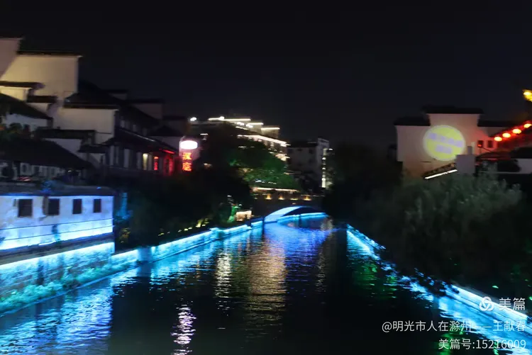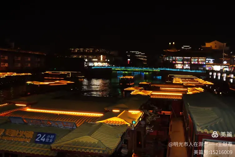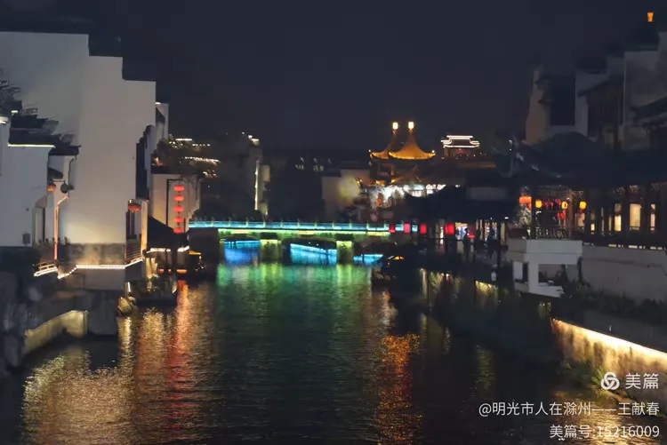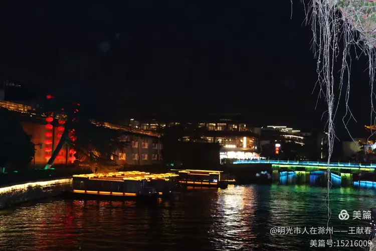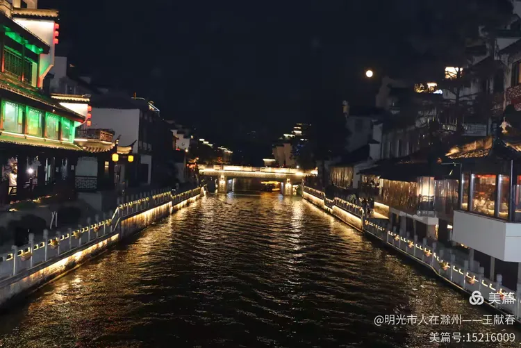 夜更深了些,水面倒映着两岸的灯火,桥影、屋檐、灯笼,全都化作流动的金线。月亮悄然升起,悬在河的尽头,清辉洒落,与人间灯火交相辉映。这一刻,我分不清是水在映灯,还是灯在追月。只知自己正站在一座城市的温柔里,被它轻轻托住。