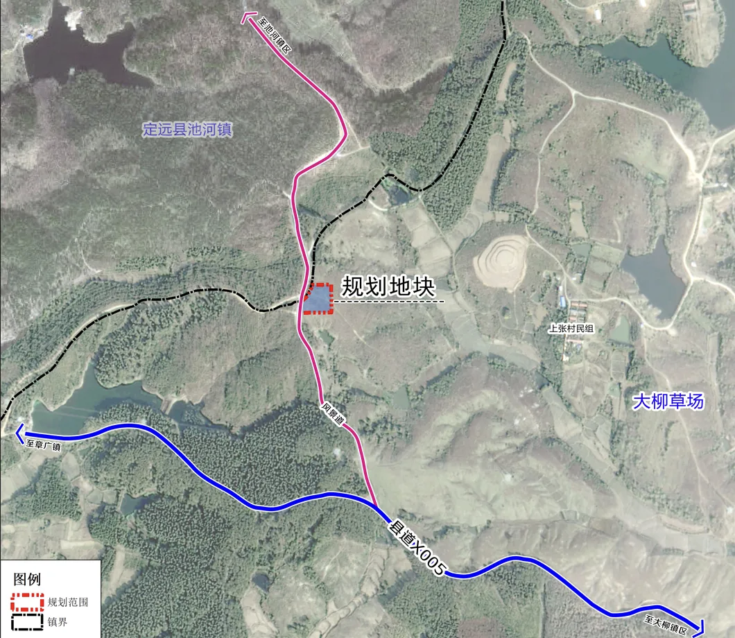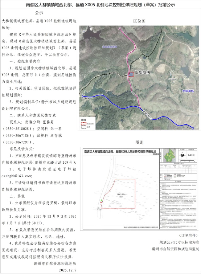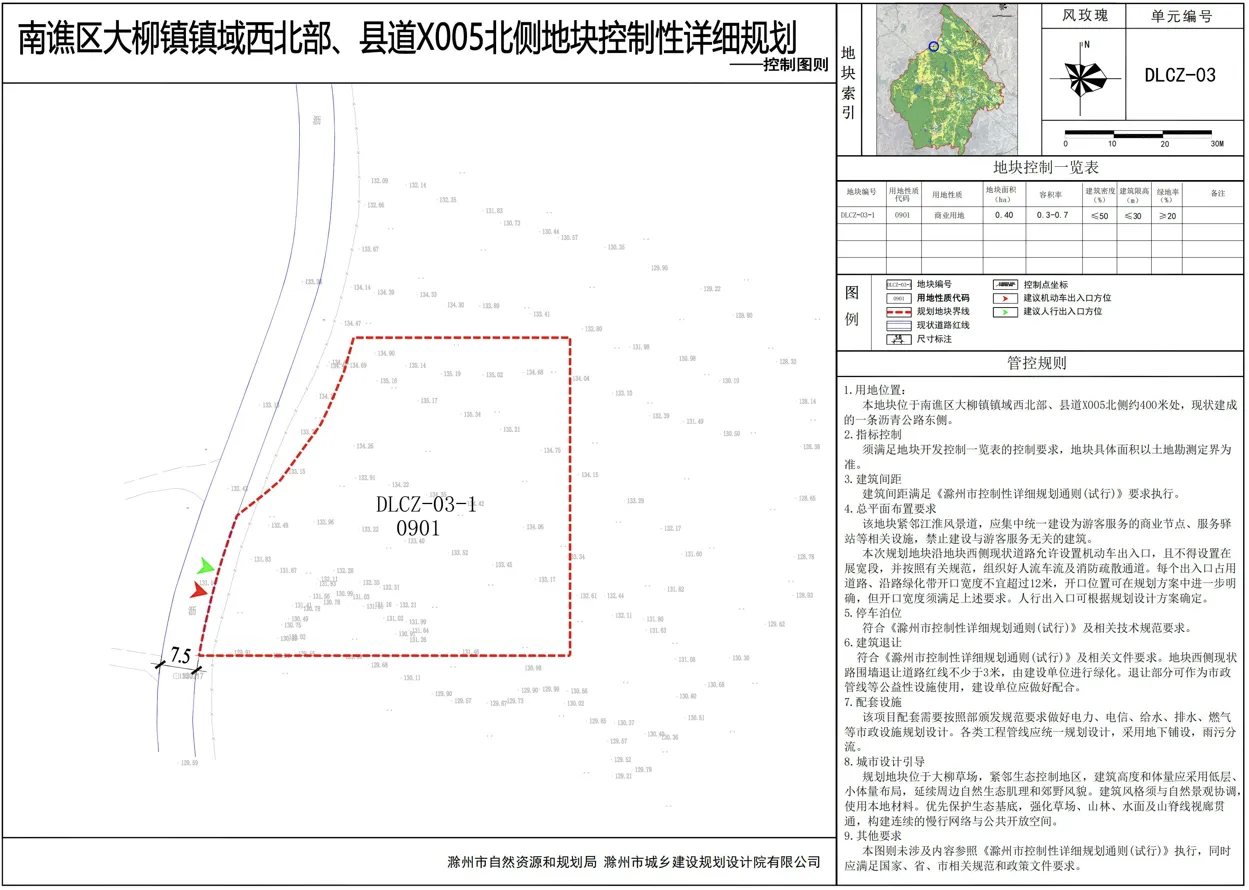 规划范围为大柳镇镇域西北部、县道X005北侧。总面积0.4公顷,规划用地性质为商业用地。该地块紧邻江淮风景道,应集中统一建设为游客服务的商业节点、服务驿站等相关设施,禁止建设与游客服务无关的建筑。本次规划地块沿地块西侧现状道路允许设置机动车出入口,且不得设置在展宽段,并按照有关规范,组织好人流车流及消防疏散通道。每个出入口占用道路、沿路绿化带开口宽度不宜超过12米,开口位置可在规划方案中进一步明确,但开口宽度须满足上述要求。人行出入口可根据规划设计方案确定。