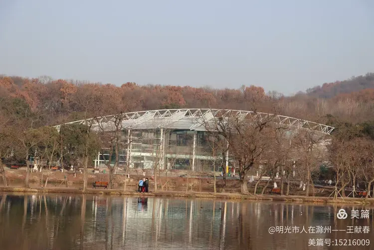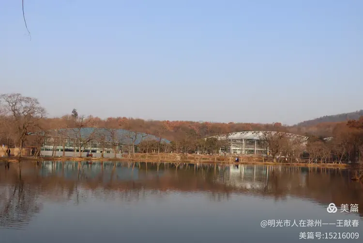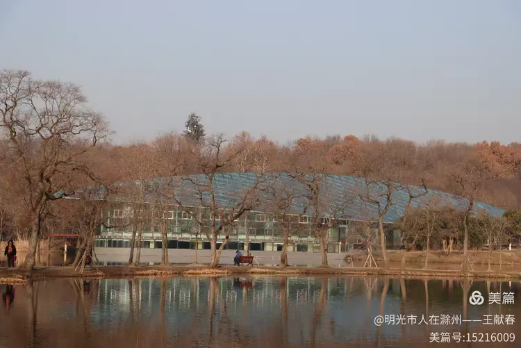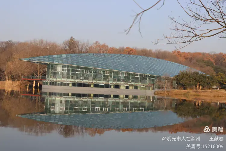 转过湖湾,那座现代感十足的玻璃屋顶建筑悄然浮现。阳光落在弧形的玻璃上,折射出粼粼光芒,像是湖面延伸出的另一片天空。建筑与湖水相依,倒影完整如画,而几棵枯树静静伫立湖畔,枝条交错,仿佛在守护这份静谧。有几位游客在湖边散步,脚步很轻,像是怕惊扰了水中的倒影。