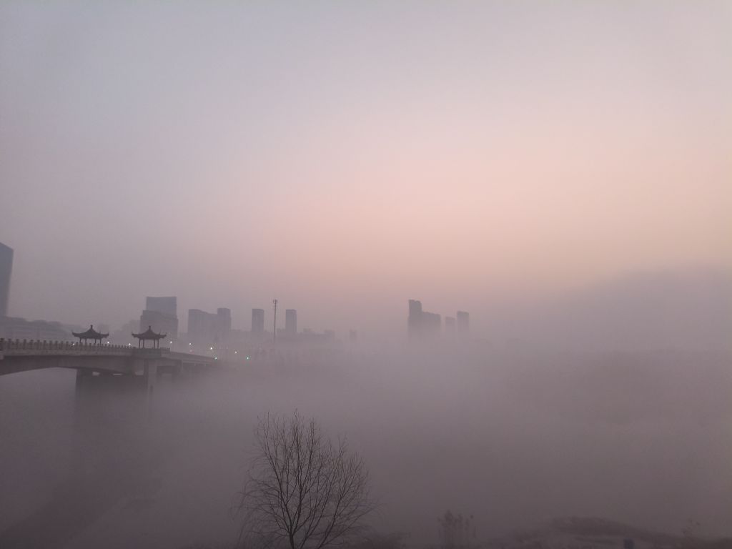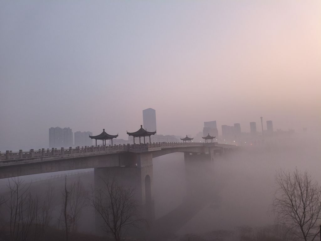 清晨的滁州,薄雾如纱,新五孔桥在氤氲的雾气中若隐若现。飞檐亭台与远处的楼宇轮廓一同融进粉紫渐变的天色里,桥身仿佛悬浮在烟霭之上,整座城市都浸在这朦胧又温柔的氛围感中,宛如一幅水墨画卷缓缓铺展。