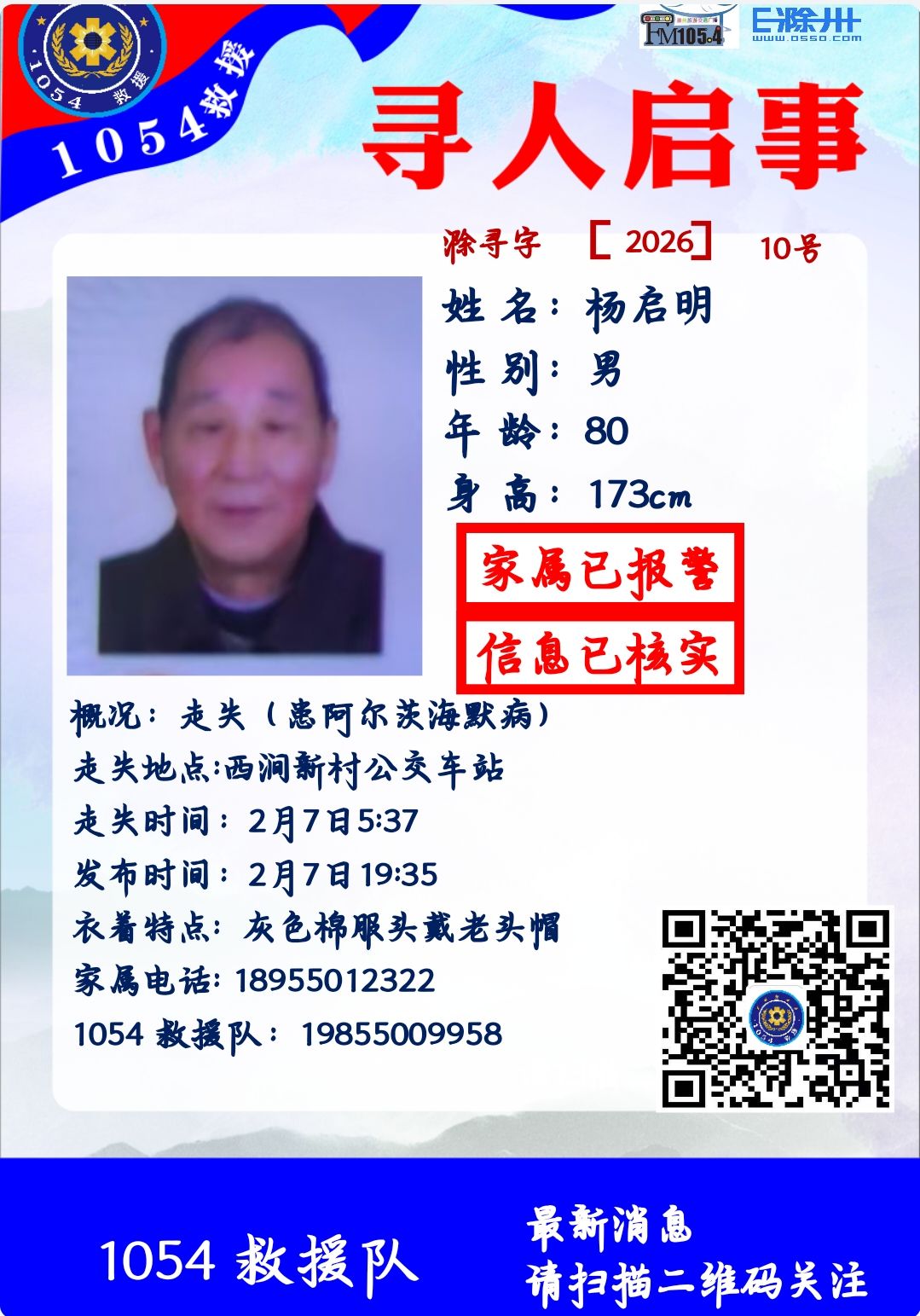 各位麻烦留意一下。这个老人,走失了,监控显示5:35到37分之间在西建新村上2路公交车。有谁看到请麻烦联系1054救援:19855009958