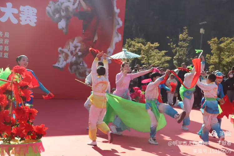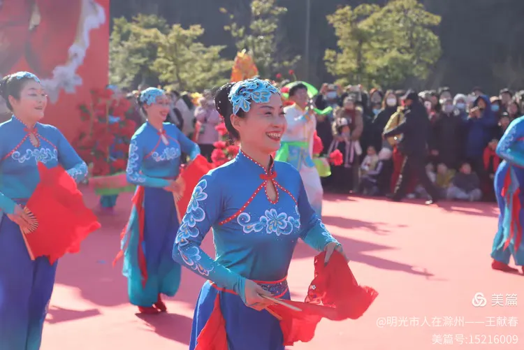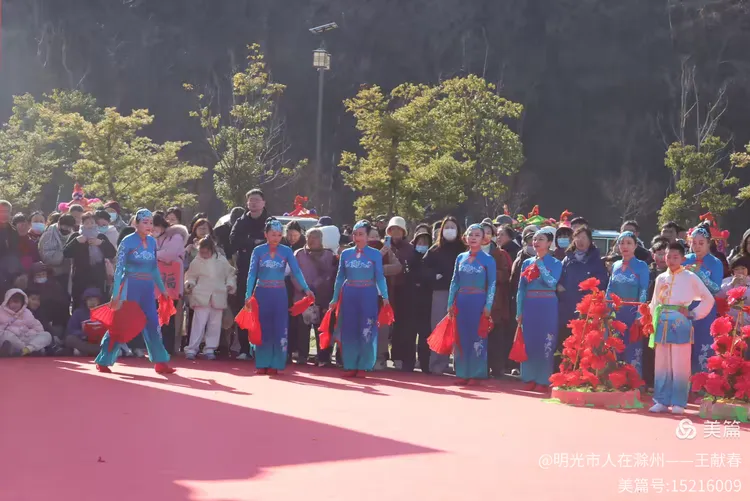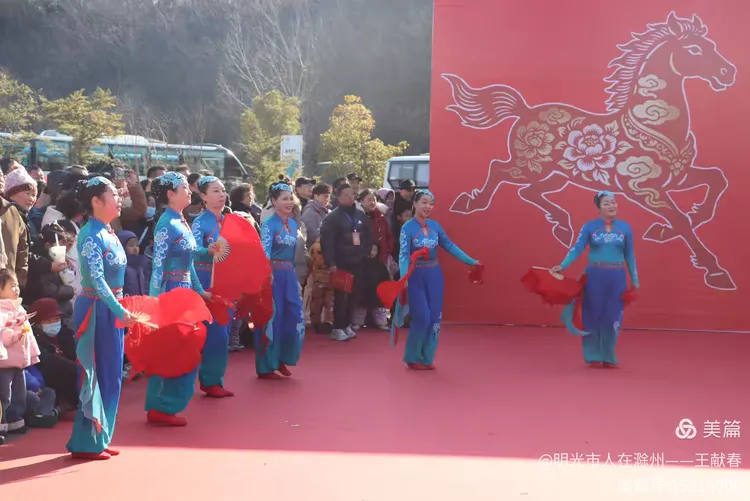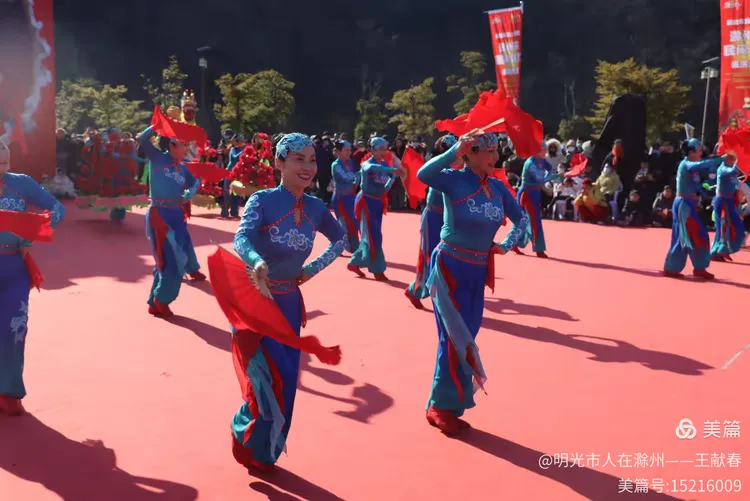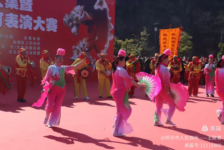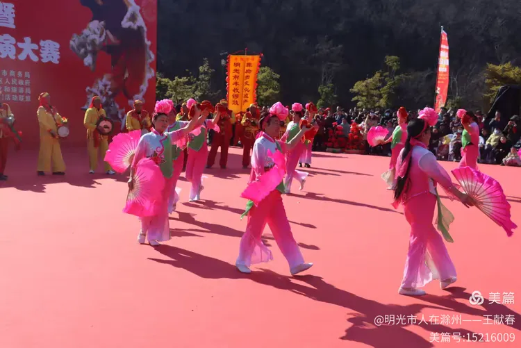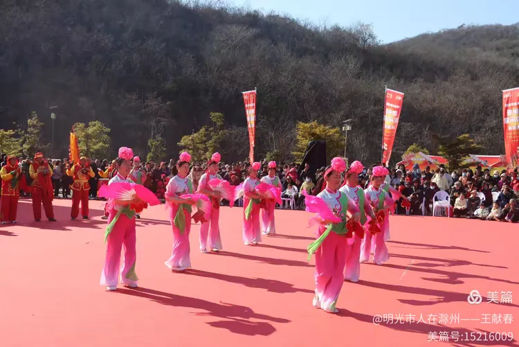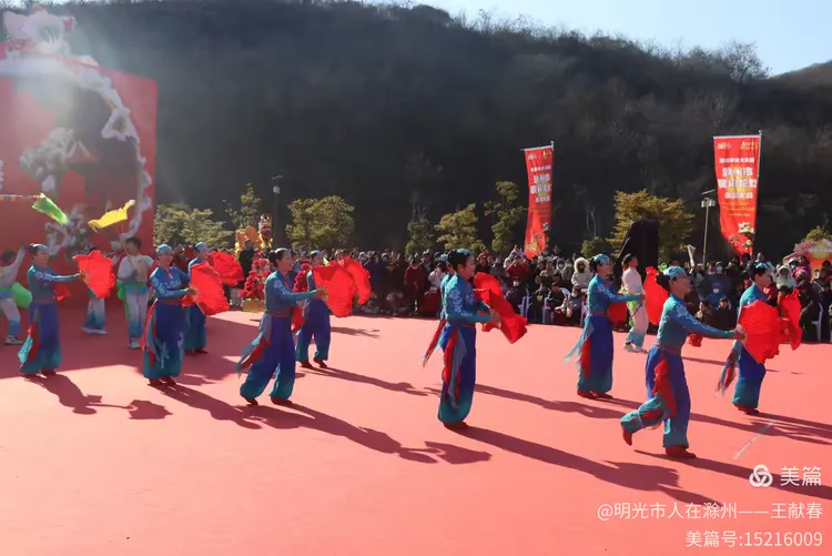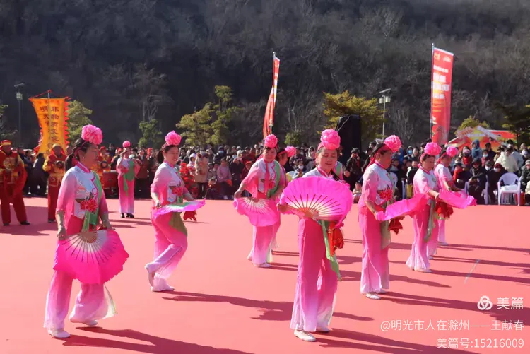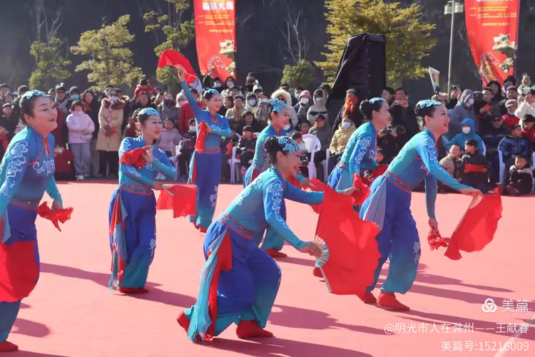 忽闻鼓点清脆,循声而去,见一方红台搭在林间空地。一群穿粉绿衣裳的舞者正甩开扇子,动作齐整如一人,粉扇开合间,像梅枝上忽绽的花。台下人围成半圈,有老人眯眼笑,有孩子踮脚张望,连山风都停了一瞬,只听扇声、鼓声、笑声,在琅琊山的午后,热热闹闹地撞在一起。