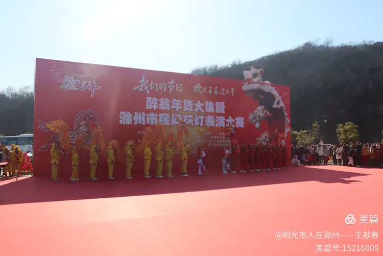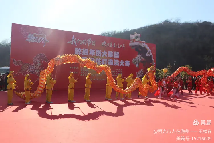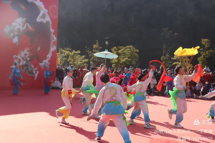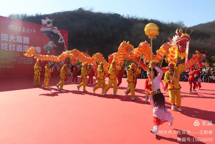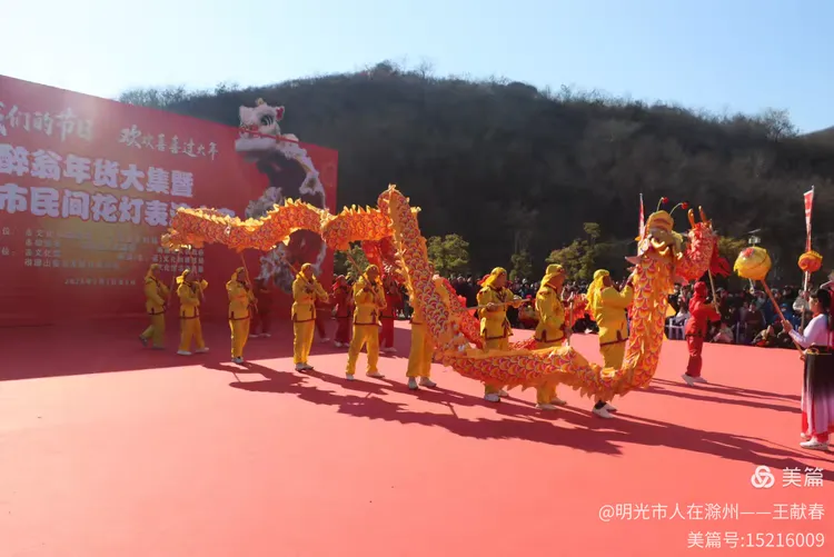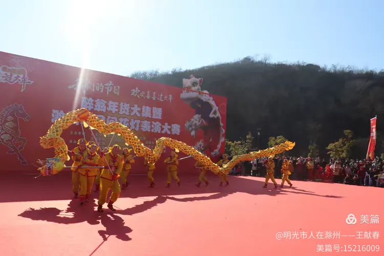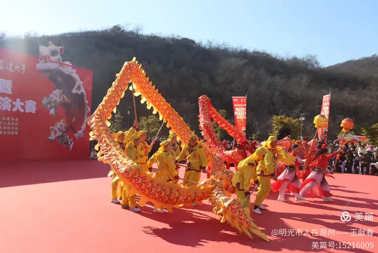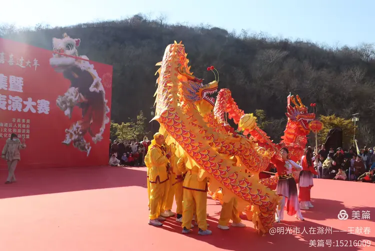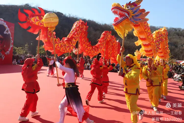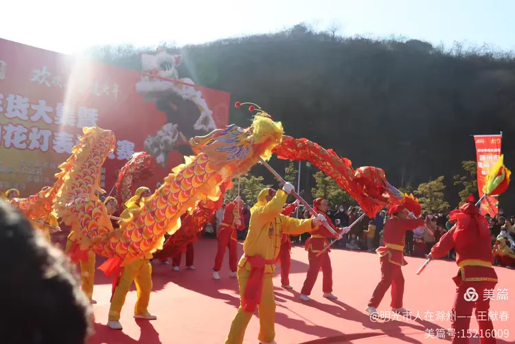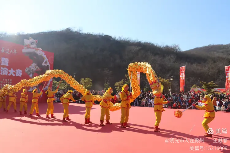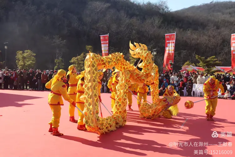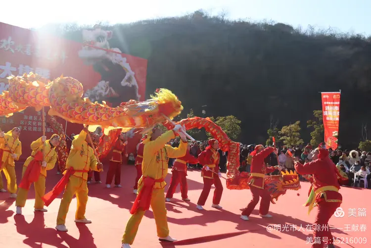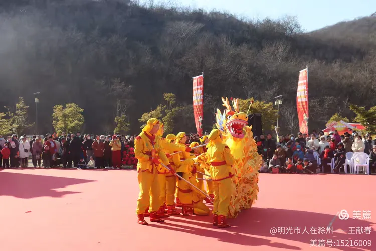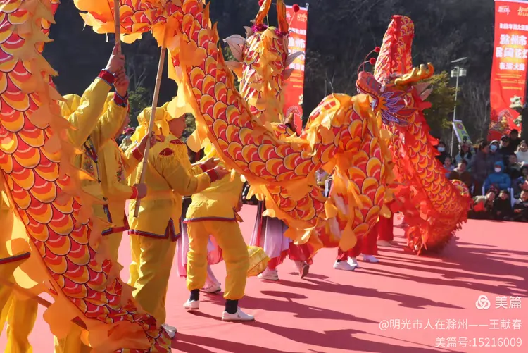 最热闹处,是那条黄红相间的长龙。十几号人擎着龙身,踏着鼓点游走,龙首高昂,龙尾轻摆,鳞片在阳光下闪闪发亮。围观的人越聚越多,有小孩骑在父亲肩头,有老人拄着拐杖笑得前仰后合。山在背后静默,龙在眼前翻腾,一静一动之间,琅琊山的下午,忽然就活了过来。