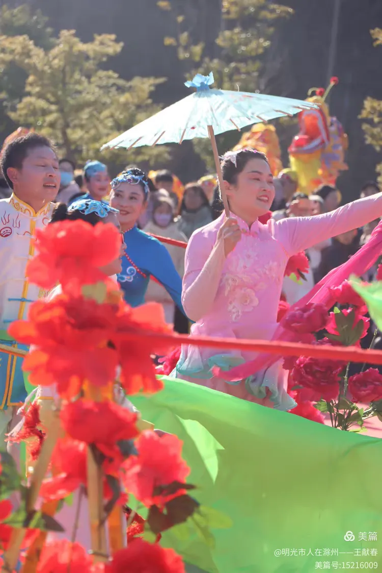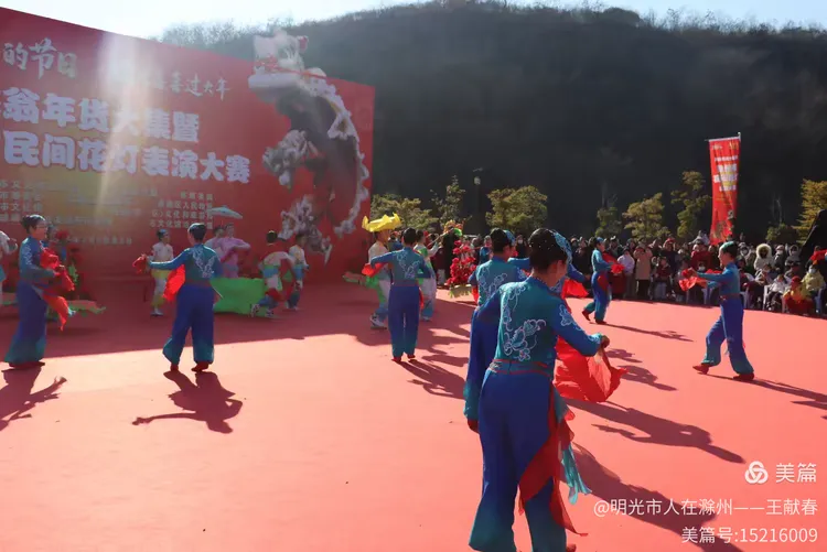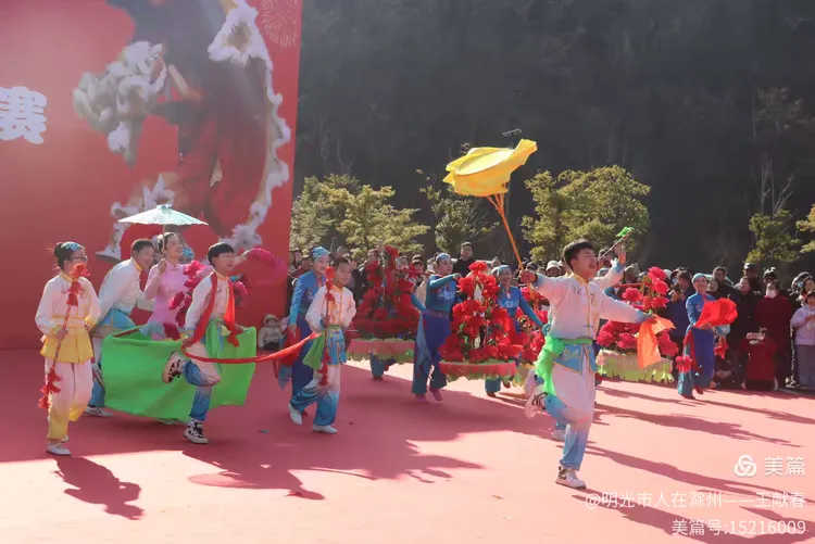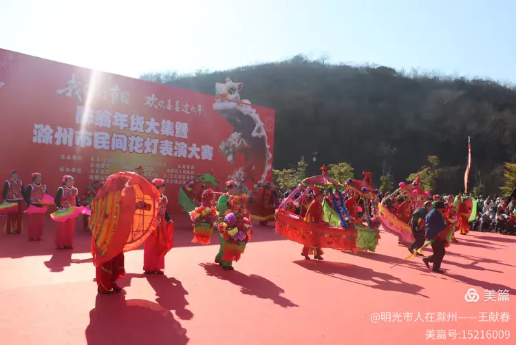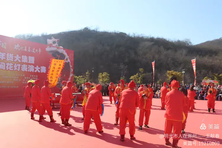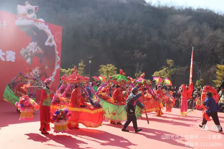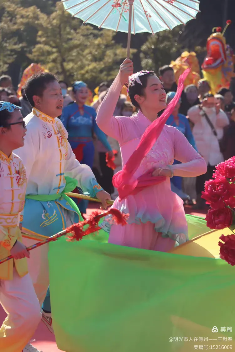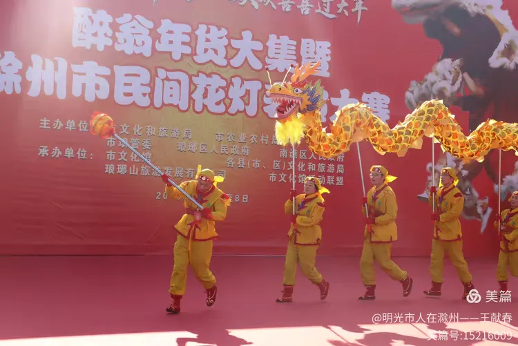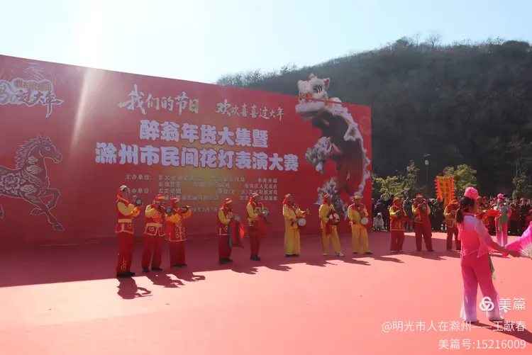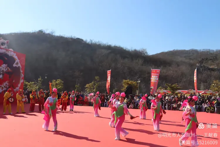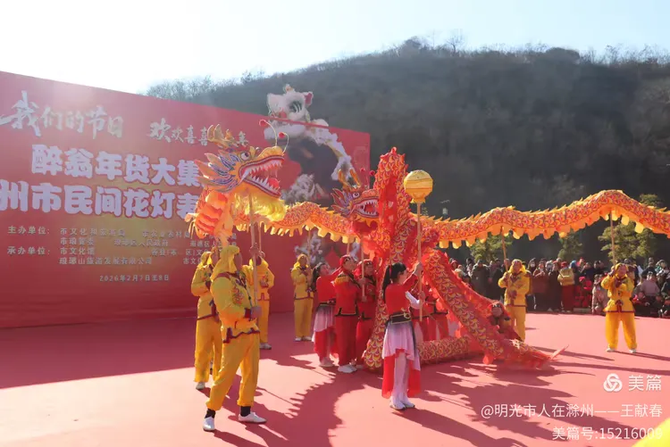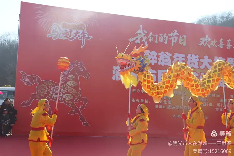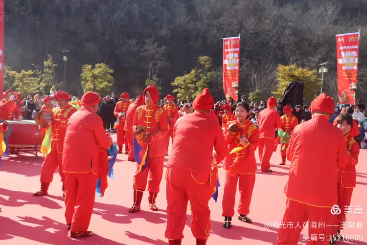 最热闹处,是那条黄红相间的长龙。十几号人擎着龙身,踏着鼓点游走,龙首高昂,龙尾轻摆,鳞片在阳光下闪闪发亮。围观的人越聚越多,有小孩骑在父亲肩头,有老人拄着拐杖笑得前仰后合。山在背后静默,龙在眼前翻腾,一静一动之间,琅琊山的下午,忽然就活了过来。