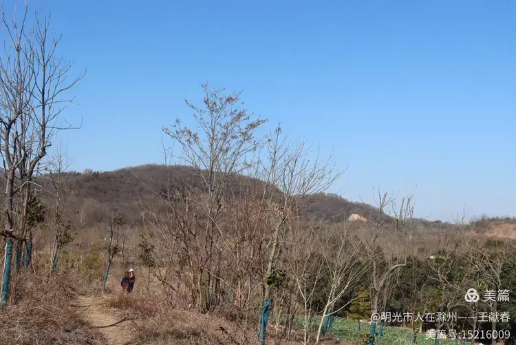 一条小径斜斜插进林子,两旁树干嶙峋,枝条疏朗,像一幅未落墨的写意画。我慢慢走着,鞋底碾过几片枯叶,沙沙轻响。山丘在远处起伏,蓝得温柔,一人独行,却无半分寂寥——山不说话,可它一直在听。