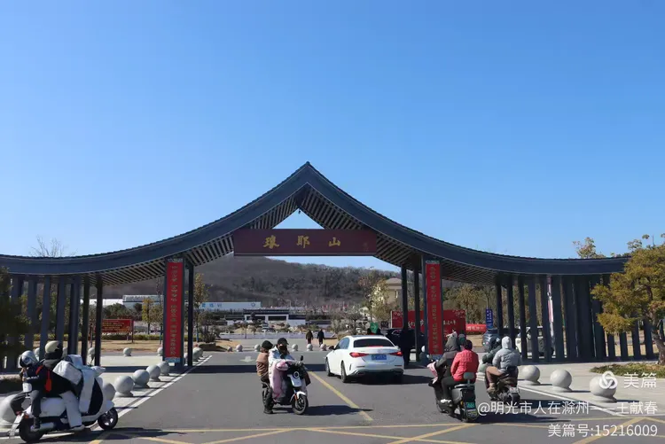 刚拐上西涧路,琅琊山的牌坊就迎面立住了。“琅琊山”三个字苍劲端方,朱红底子被阳光一照,亮得晃眼。两侧对联红纸未褪,墨字犹润,像是刚贴不久,年味还热乎着。电动车嗖嗖掠过,白车慢悠悠拐进侧道,几个行人裹着围巾慢走,脚步不急,连影子都懒洋洋的。山丘在背后绵延,不说话,只把青灰的轮廓托在澄澈天光里。