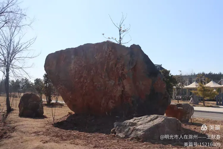 一块巨大的红色岩石静默地立在空地上,像一位守山的老者,表面粗粝,深浅不一的红褐色纹路里,嵌着风霜与日照的年轮。我绕它踱了半圈,指尖拂过微温的石面,阳光正斜斜地铺在几块散落的小石上,光秃的树影被拉得细长,轻轻晃在草尖。远处楼宇安静,天空蓝得坦荡——这山脚下的片刻闲步,竟有种不期而遇的笃定。