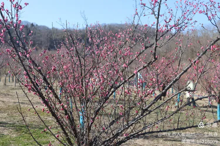 转过一道缓坡,忽见一片梅林。枝干横斜,粉红花苞缀满枝头,有的已盛放,有的半开,像把冬的冷意悄悄酿成了甜。山丘在花后铺展,天是那种洗过似的蓝,风一吹,花瓣便轻轻颤,仿佛整座山都在屏息,怕惊了这初春的私语。